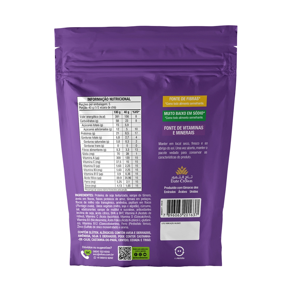 A Granola Proteica SoulPro, em parceria com Renato Cariani, traz uma deliciosa combinação de mix de cereais com aveia, tâmara e amêndoa, sabor baunilha para enriquecer sua refeição. Com um sabor irresistível, ela oferece 21 g de proteínas em 100 g, além de ser uma excelente fonte de vitaminas A, C, D, B3, B12 e ferro. Adoçada naturalmente com xarope de tâmaras, esta granola também é rica em fibras e contém baixo sódio, tornando-se uma escolha saudável e equilibrada. Perfeita para quem tem um estilo de vida ativo e busca um produto completo e nutritivo para complementar suas refeições. INGREDIENTES: Proteína de soja texturizada, xarope de tâmara, aveia em flocos, flakes proteicos de arroz, tâmara em pedaços, flocos de milho não transgênico, amêndoa, psyllium em flocos (Plantago ovata), óleos vegetais (milho, soja e algodão), cúrcuma, sal, edulcorantes xarope de maltitol e sucralose, antioxidantes lecitina de soja, ácido cítrico, BHA e BHT, Vitamina A (Acetato de retinol), Vitamina C (Ácido Ascórbico), Vitamina D (Colecalciferol), Vitamina B3 (Nicotinamida), Ácido Fólico (Ácido N-pteroil-L-glutâmico), Vitamina B12 (Cianocobalamina), Ferro (Pirofosfato férrico), Zinco (Sulfato de zinco monoidratado) e aroma. ALÉRGICOS: CONTÉM AVEIA E DERIVADOS, AMÊNDOA, SOJA E DERIVADOS. PODE CONTER CASTANHA-DE-CAJU, CASTANHA-DO-PARÁ, CENTEIO, CEVADA E TRIGO. CONTÉM GLÚTEN. PROTEICO, FONTE DE FIBRAS, ADOÇADO COM XAROPE DE TÂMARAS, FONTE DE VITAMINAS E MINERAIS.