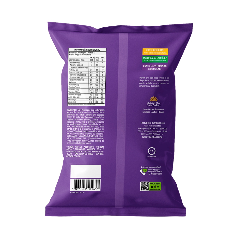A Granola Proteica SoulPro, em parceria com Renato Cariani, traz uma deliciosa combinação de mix de cereais com aveia, tâmara e amêndoa, sabor baunilha para enriquecer sua refeição. Com um sabor irresistível, ela oferece 21 g de proteínas em 100 g, além de ser uma excelente fonte de vitaminas A, C, D, B3, B12 e ferro. Adoçada naturalmente com xarope de tâmaras, esta granola também é rica em fibras e contém baixo sódio, tornando-se uma escolha saudável e equilibrada. Perfeita para quem tem um estilo de vida ativo e busca um produto completo e nutritivo para complementar suas refeições. INGREDIENTES: Proteína de soja texturizada, xarope de tâmara, aveia em flocos, flakes proteicos de arroz, tâmara em pedaços, flocos de milho não transgênico, amêndoa, psyllium em flocos (Plantago ovata), óleos vegetais (milho, soja e algodão), cúrcuma, sal, edulcorantes xarope de maltitol e sucralose, antioxidantes lecitina de soja, ácido cítrico, BHA e BHT, Vitamina A (Acetato de retinol), Vitamina C (Ácido Ascórbico), Vitamina D (Colecalciferol), Vitamina B3 (Nicotinamida), Ácido Fólico (Ácido N-pteroil-L-glutâmico), Vitamina B12 (Cianocobalamina), Ferro (Pirofosfato férrico), Zinco (Sulfato de zinco monoidratado) e aroma. ALÉRGICOS: CONTÉM AVEIA E DERIVADOS, AMÊNDOA, SOJA E DERIVADOS. PODE CONTER CASTANHA-DE-CAJU, CASTANHA-DO-PARÁ, CENTEIO, CEVADA E TRIGO. CONTÉM GLÚTEN. PROTEICO, FONTE DE FIBRAS, ADOÇADO COM XAROPE DE TÂMARAS, FONTE DE VITAMINAS E MINERAIS.