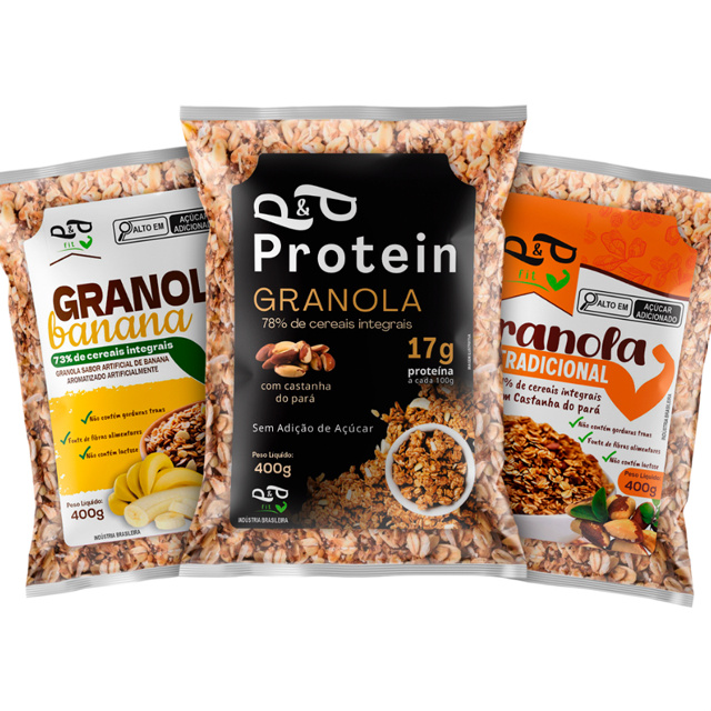 KIT SUPER ECONÔMICO CONTENDO: - 1x Pacote 400g Granola Protein Ingredientes: Aveia em Flocos, proteínas de soja texturizada, flocos de arroz, uvas-passas, cereal integral de trigo e milho sabor ameixa e castanha do pará - 1x Pacote 400g Granola Tradicional Ingredientes: Aveia em Flocos, açúcar mascavo, flocos de milho, coco ralado adocicado, uvas passas e castanha do pará - 1x Pacote 400g Granola Banana Ingredientes: Aveia em Flocos, Açúcar Mascavo, açúcar Cristal e aroma artificial de Banana
