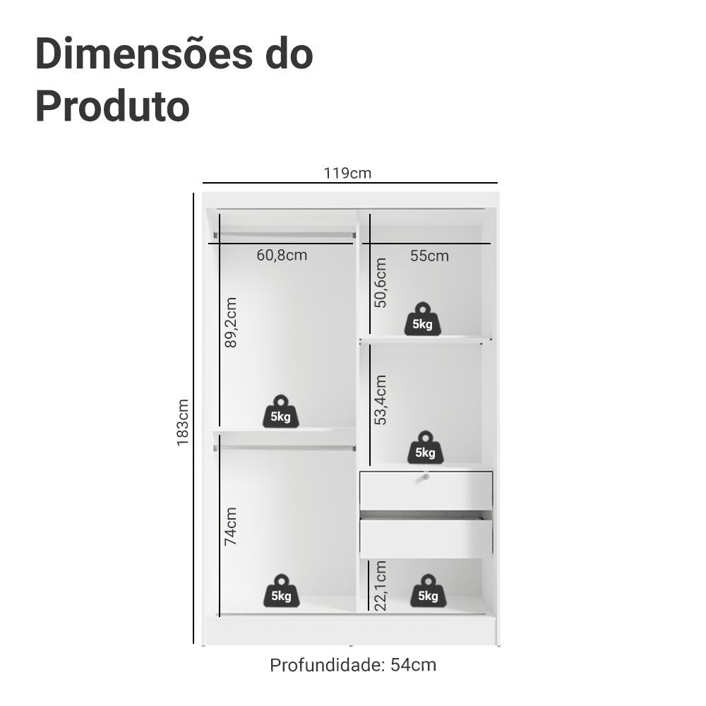 Este Kit Infantil Madesa combina praticidade, funcionalidade e um design moderno para transformar o quarto das crianças em um ambiente aconchegante e organizado. O Guarda-Roupa do conjunto possui duas portas de correr com trilhos metálicos e deslizamento suave. Os puxadores são em alumínio, mais resistentes para o uso diário. Internamente o espaço é ótimo: são duas gavetas com corrediças metálicas, sendo que uma delas possui fechadura, para uma maior segurança. Além disso, são cinco nichos e dois cabideiros de metal. Já a cômoda infantil conta com seis gavetas espaçosas para armazenar roupas, acessórios e brinquedos. Fabricada com materiais de ótima qualidade, possui corrediças metálicas, puxadores em alumínio. Para completar, o acabamento branco dos produtos é resistente e garante maior durabilidade ao móvel. Medidas do guarda-roupa: - 183 cm de altura - 119 cm de largura - 54 cm de profundidade Medidas da cômoda: - 76 cm de altura - 150 cm de largura - 39 cm de profundidade O que você recebe: - Um Guarda-Roupa com duas portas de correr - Uma Cômoda com seis gavetas - Manual de montagem e ferragens Código do produto: MDDR02005209 É bom saber: - Imagens meramente ilustrativas - A Madesa não disponibiliza serviço de montagem - Material: MDP A Madesa se dedica à sustentabilidade com várias iniciativas: temos uma usina própria para gerar energia que abastece uma de nossas fábricas. Todo o plástico utilizado no setor produtivo é proveniente de reciclagem e as suas sobras são encaminhadas ao fornecedor que os recicla. Garantia: Este produto conta com 1 ano de garantia total, sendo 3 meses de garantia legal e 9 meses de garantia contratual. A garantia cobre exclusivamente defeitos de fabricação e vícios ocultos. Não estão cobertos: problemas decorrentes de montagem incorreta, uso inadequado, exposição à umidade, calor ou luz solar direta, modificações no produto ou desgaste natural.