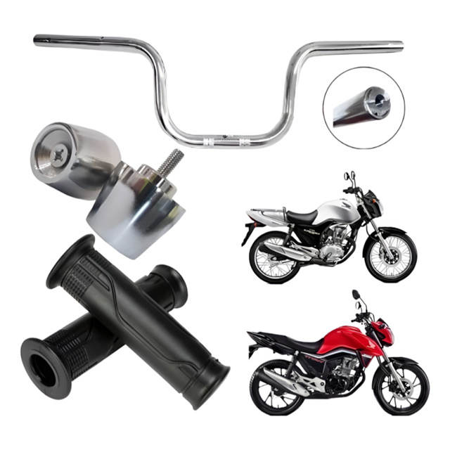 KIT GUIDÃO COMPLETO PARA CG 160 — CONFORTO, ESTILO E DESEMPENHO EM UM SÓ CONJUNTO Transforme o visual e a pilotagem da sua moto com este kit completo, composto por guidão cromado modelo Cargo 160, manoplas modelo original e pesos de guidão em aço. Um conjunto que une design, resistência e conforto para deixar sua moto com acabamento impecável e pilotagem mais estável. 1. Guidão Cromado Modelo Cargo 160 Medidas: - Espessura: 2,2 c - Comprimento total: 69 cm - Altura: 15 cm Aplicação: - Honda CG 160 (Titan / Fan / Start / Cargo) – anos 2016 a 2023 2. Manopla Modelo Original Especificações: - Material: Borracha de alta durabilidade - Encaixe perfeito no guidão - Fácil instalação - Modelo padrão original (Não acompanha roldana) 3. Peso de Guidão em Aço 1045 Melhore a estabilidade e reduza vibrações no guidão com estes pesos resistentes e duráveis. - Peso total: 460 g - Material: Aço 1045 com parafuso inox (6 cm) Compatibilidade: Universal (para guidões com furo e rosca interna)