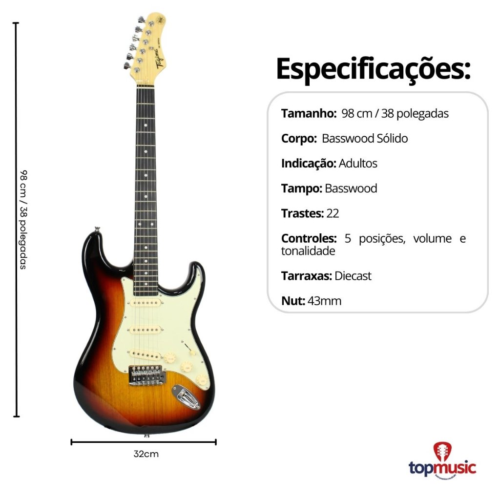 Itens Inclusos: 1x - Guitarra Tagima Tg500 Stratocaster Tw Series 1x - Capa Guitarra Luxo Acolchoada Alça Mochila 1x - Afinador Digital Strinberg 1x - Correia Guitarra 5cm Castanho 3x - Palheta Strinberg Sortida Guitarra 1x - Cabo P10 P10 Emborrachado 5m 1x - Amplificador Guitarra 15 Watts Cubo A guitarra Tagima Stratocaster Woodstock TG500 é a escolha perfeita para músicos que buscam versatilidade e sonoridade marcante. Com corpo em poplar, braço em maple e escala em tech wood, este modelo oferece conforto e uma tocabilidade suave para estilos que vão do rock ao blues. Seus captadores cerâmicos single coil proporcionam timbres nítidos e dinâmicos, garantindo uma excelente resposta tanto em limpos cristalinos quanto em drives encorpados. A ponte tremolo adiciona ainda mais expressividade, permitindo bends e vibratos precisos. Disponível em diversas cores modernas e clássicas, como Sunburst, Olympic White e Metallic Purple, a TG500 combina estilo e performance. O design ergonômico aliado à chave de 5 posições e controles intuitivos permite ao músico explorar diferentes tonalidades com facilidade. Especificações: Modelo: TG-500 Marca: Tagima Corpo: Poplar Braço: Maple Shape c Escala: Tech wood - 22 Trastes - 25.5 polegadas - Raio 9.5 polegadas Nut: Plástico - 43mm Captadores: 3 Single coils cerâmicos by Tagima Controles: Chave 5 posições, volume e tonalidade Ponte: Tremolo Tarraxas: Diecast Cores: Black, Sunburst, Candy apple, Metallic purple, Metallic surf green, Metallic gold yellow, Olympic white Escudo: Black, Aged white Amplificador: Marca: Sheldon Modelo: Gt1200 Potência 15 Watts Entrada P-10 para instrumentos com controle de ganho Saída P-10 para Fones de ouvido Efeito Turbo Drive (Distorção) Controles de Graves, Agudos e Master (Volume) Alto-falante de 6 polegadas Alimentação: Bivolt Controles: Gain, Turbo Drive (Distorção), Bass, Middle, Treble e Master (Volume) Dimensões: 265mm (L), 256mm (A), 143mm (P) Produto 100% original, somos revendedor autorizado Tagima.