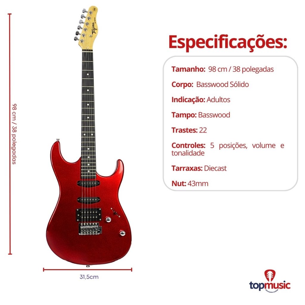 Itens inclusos: 1x - Guitarra Tagima Tg510 Stratocaster Tw Series 1x - Capa Guitarra Luxo Acolchoada 1x - Afinador Digital 1x - Correia Basso 3x - Palheta Sortida Guitarra 1x - Cabo P10 P10 5 Metros Descrição A guitarra de entrada Tagima TG510 é a escolha ideal para quem busca qualidade e versatilidade a um ótimo custo-benefício. Com corpo em basswood e braço em maple com formato C, ela oferece conforto e tocabilidade suave. Equipada com captadores cerâmicos – um humbucker e dois single coils by Tagima – a TG510 proporciona uma ampla variedade de timbres, perfeita para explorar diferentes estilos musicais. Perfeita para iniciantes que buscam um instrumento acessível sem abrir mão da qualidade, acompanhada com ponte tremolo que adiciona um toque extra de versatilidade, possibilitando a criação de efeitos expressivos. Especificações: Modelo: TG-510 Marca: Tagima Corpo: Basswood Braço: Maple Shape c Escala: Tech wood - 22 Trastes - 25.5 polegadas - Raio 9.5 polegadas Nut: Plástico - 43mm Captadores: Humbucker cerâmico e 2 single coils cerâmicos by Tagima Controles: Chave 5 posições, volume e tonalidade Ponte: Tremolo Tarraxas: Diecast Cores: Metallic gold yellow, Black, Candy apple, Metallic purple, Metallic blue, Metallic surf green, White Produto 100% original, somos revendedor autorizado Tagima.