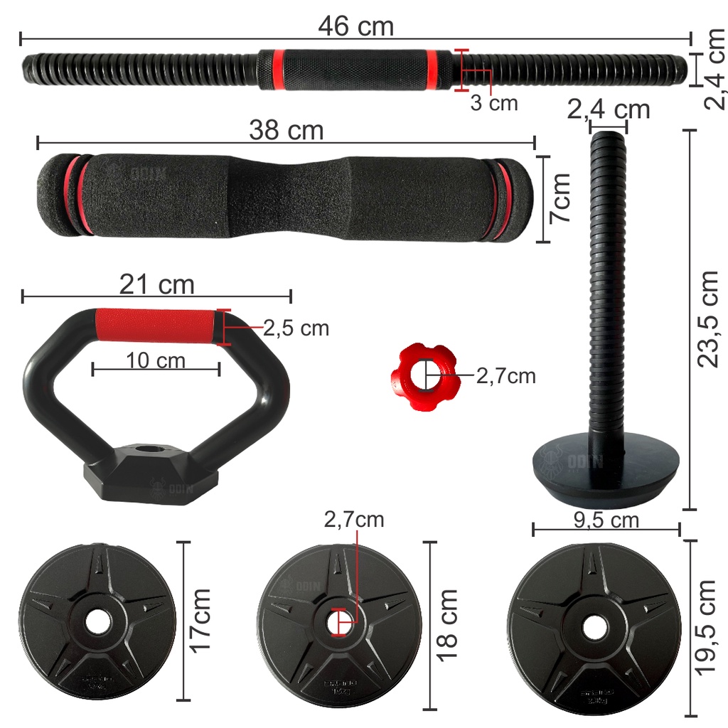 O kit multifuncional 6 em 1 Odin Fit é um kit versátil que te possibilita um treino completo com inúmeros exercícios. O kit te proporciona várias formas de montagens como: Kettlebell, Par de Halteres, Halter com pegada externa, Apoio fixo para flexão, barra 97cm e barra 110cm sendo todos estes com peso ajustável. Um único kit te permite ter os principais equipamentos para um treino de pernas, braços, costas, bíceps, tríceps e demais grupos musculares que podem ser trabalhados com um treino de pesos livres. A possibilidade de ajuste de carga te permitirá alterar os níveis de exercícios a serem realizados com esse kit. O kit Odin Fit acompanha 20kg em anilhas podendo ser montado da forma que desejar, com todas as anilhas, ou com a quantidade de peso que desejar, podendo também ser utilizado sem carga (apenas o peso das barras). Acompanha 4 anilhas de 1,25kg, 4 anilhas de 1,5kg e 4 anilhas de 2kg, permitindo uma infinidade de combinações de pesos, se adequando à sua necessidade. O kit multifuncional de barras e kettlebell Odin Fit possui 22 itens te permitindo uma infinidade de montagens para realizar o seu treino em casa ou onde quiser. Composição do kit: 4 anilhas com revestimento em ABS de 1,25kg; 4 anilhas com revestimento em ABS de 1,5kg; 4 anilhas com revestimento em ABS de 2kg; 2 barras rosqueáveis 46cm; 1 barra rosqueável revestida em EVA 38cm; 1 base para montagem de kettlebell; 2 puxadores para kettlebell (que servem como apoio fixo para flexão); 4 presilhas de rosca para as barras; Especificações: Diâmetro da barra central revestida por EVA: 7cm; Comprimento da barra revestida por EVA: 38cm; Material da barra halter: Tubo de aço de alta densidade, revestido em ABS de alta resistência; Comprimento da barra halter: 46cm; Diâmetro da barra halter: 2,4cm na área de suporte das anilhas e 3cm no centro (pegada); Diâmetro da circunferência interna das anilhas: 2,7cm; Composição das anilhas: Pó de ferro + cimento, revestido em ABS de alta resistência Revestimento das anilhas: ABS de alta resistência; Material das presilhas rosqueáveis: ABS; Altura da base para montagem do Kettlebell: 13,7cm; Diâmetro do apoio da base para montagem de kettlebell: 9,9cm; Diâmetro da pegada do puxador do kettlebell/apoio fixo: 2,5cm; Peso ajustável? Sim; Possibilidades de montagem: Kettlebell, Par de Halteres, Halter com pegada externa, Apoio fixo para flexão, barra 97cm e barra 110cm (variável conforme montagem). Peso máximo na montagem do kettlebell: 9,25kg; Peso mínimo na montagem do kettlebell: 530g (sem anilhas, só a base + puxador); Peso máximo possível na montagem de 1 halter: 14 kg; Peso mínimo na montagem de 1 halter: 330g (só a barra sem anilhas); Peso máximo na montagem da barra completa: 20kg; Peso mínimo na montagem da barra 97cm: 1,125 kg (só a barra sem anilhas); Peso de suporte máximo recomendado: 20kg *Não é recomendado utilizar anilhas extras que não acompanhem o kit. Obs: Produto não acompanha maleta. Alguns exemplos de exercícios que podem ser realizados com o kit musculação multifuncional Odin Fit: Kettlebell: stiff, agachamentos, afundos, remada curvada, desenvolvimento, abdominal twist, swings, get ups, remadas, halo, pullover, entre outros. Par de halteres: supino, elevações, extensão de tríceps, trações, flexões de braço, remada, rosca direta/martelo, desenvolvimento, avanço, stiff, crucifixo, entre outros. Halter com pegada externa: remada aberta curvada, rosca martelo, pullover, entre outros. Apoio Fixo para Flexão: Flexão de braços, prancha alta pegada neutra; Barra reta 97cm: Levantamento terra, agachamento, avanço, supino, rosca direta, desenvolvimento, pullover, elevações, remadas, entre outros. Barra reta 110cm (variável conforme montagem): Levantamento terra, agachamento, avanço, supino, rosca direta, desenvolvimento, pullover, elevações, remadas, entre outros. Garantia de 3 meses contra defeitos de fabricação.