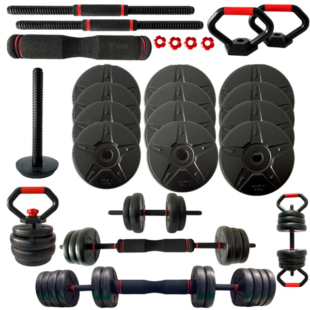Kit Halteres Musculação Kettlebell Barra Anilhas 6 em 1 Peso 20kg Academia