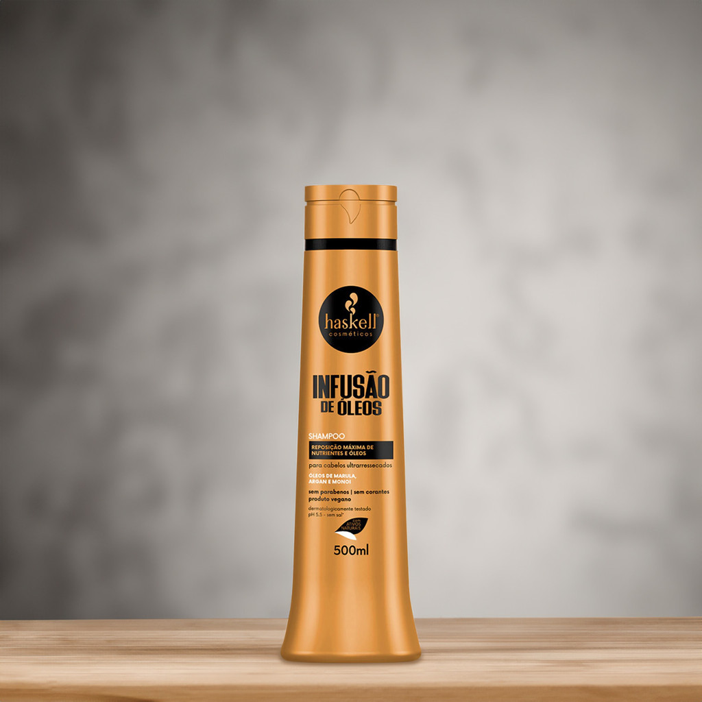 Kit Haskell Infusão de Óleos Shampoo e Máscara (2 produtos) Este Kit Contém Haskell Infusão de Óleos - Shampoo 500ml: para todos os tipos de cabelo. Promove uma limpeza suave e hidrata os fios de modo especial. Traz em sua formulação a combinação de óleos vegetais que oferecem uma nutrição de alto patamar aos fios. Com fragrância delicada, proporciona um banho relaxante e revigorante. Perfeito para madeixas nutridas, sedosas e com um brilho extraordinário. Livre de parabenos, sulfatos e petrolatos. Haskell Infusão de Óleos - Máscara Capilar 500g: tratamento altamente nutritivo, repara profundamente o ressecamento dos cabelos. Desenvolvida para nutrir e restaurar fios severamente secos. Fórmula rica em óleos nobres, repõe os lipídeos e nutrientes perdidos, combatendo o aspecto seco e protegendo os fios contra danos externos. Proporciona hidratação intensa, brilho radiante e uma revitalização completa dos cabelos. Livre de parabenos, sulfatos e petrolatos. Conselho de Aplicação Shampoo: distribua sobre os cabelos molhados e massageie suavemente. Por fim, enxágue. Repita novamente se necessário. Máscara: após lavar os cabelos, aplique a máscara mecha por mecha, do comprimento às pontas. Massageie e deixe agir por 10 minutos. Após a pausa, enxágue.