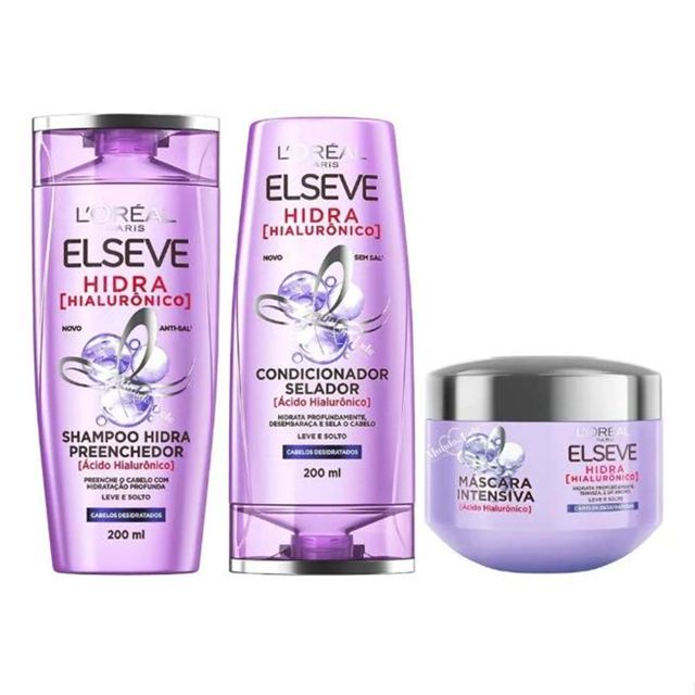 O Kit Contém: 1 Shampoo Preenchedor L'Oréal Paris Elseve Hidra Hialurônico, 200ml 1 Condicionador Selador L'Oréal Paris Elseve Hidra Hialurônico, 200ml 1 Creme de Tratamento Preenchedor L'Oréal Paris Elseve Hidra Hialurônico, 300g Sobre a Linha Elseve Hidra Hialurônico de L’Oréal Paris: A Linha Elseve Hidra Hialurônico de L’Oréal Paris preenche e retém hidratação profunda na fibra capilar para uma transformação instantânea dos fios. Com ação Preenchedora, retém a hidratação na fibra capilar por muito mais tempo, para manter o cabelo saudável, leve e solto. Tecnologia: Desenvolvido com agentes condicionantes inteligentes, garante hidratação profunda e controle de Frizz. Sua fórmula foi desenvolvida com Ácido Hialurônico, ativo capaz de reter até 1000 vezes seu peso em água e amplamente conhecido por seu poder preenchedor e hidratante, retém a hidratação na fibra capilar por muito mais tempo, para manter o cabelo saudável, hidratado e solto. Benefícios: - Desenvolvido com agentes condicionantes inteligentes, garantindo hidratação profunda - Com Ácido Hialurônico: hidratação profunda e preenchimento da fibra capilar - Controle de frizz - Cabelos leves, soltos e saudáveis - Desembaraça os fios - Brilho intenso sem pesa