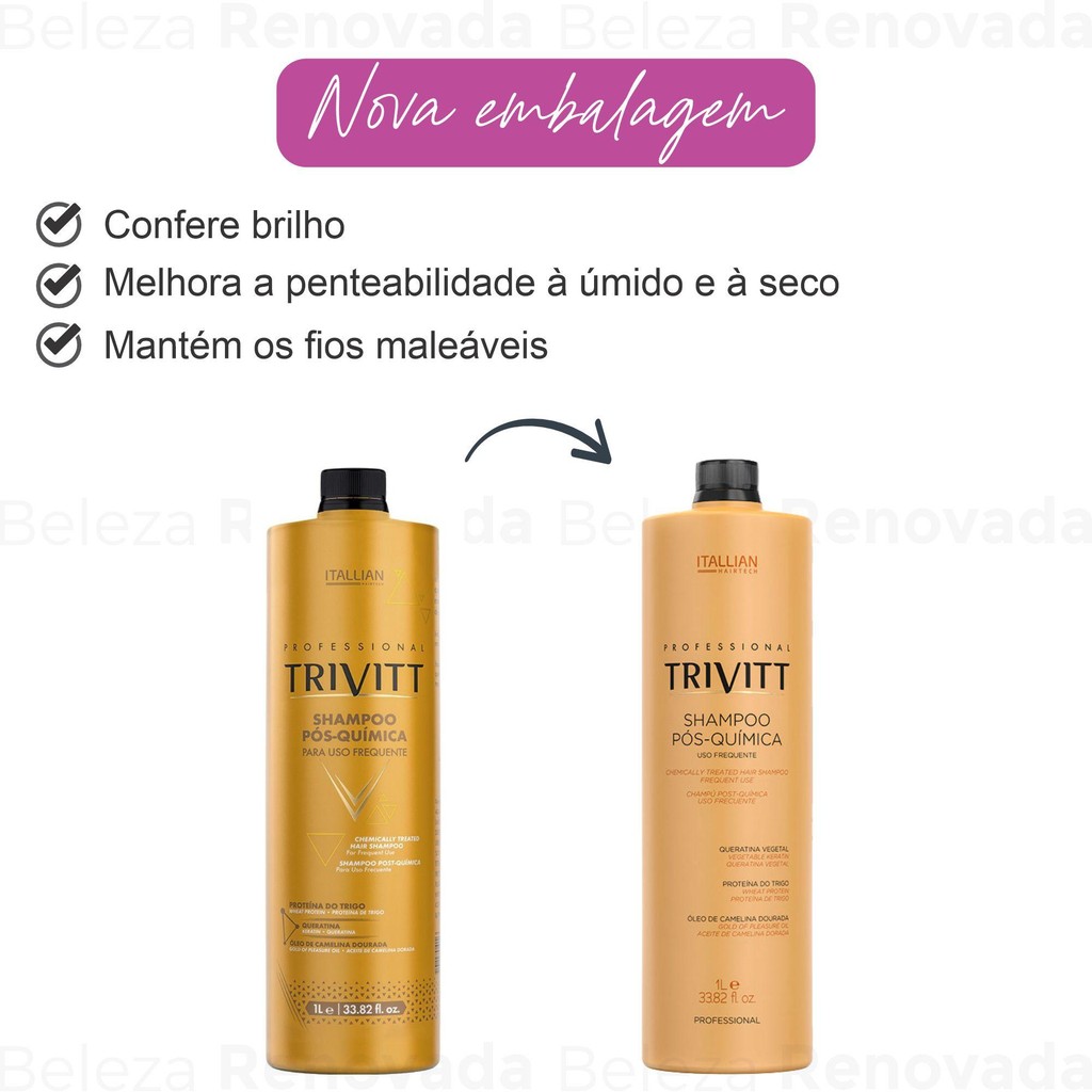 Kit Hidratação Trivitt Profissisional Itallian ReconstruçãoDescrição:O Kit Profissional Trivitt é ideal para o tratamento de cabelos quimicamente tratados, proporcionando hidratação profunda, cauterização dos fios e reconstrução das áreas danificadas. O Itallian Trivitt Kit Profissional fortalece os fios, recuperando a resistência contra quebra, o brilho e a maciez. Agora com exclusiva fórmula, contendo Proteína do Trigo, Queratina e Óleo de Camelina Dourada, totalmente livre de Parabenos. Indicado para cabelos quimicamente tratados, é o kit completo para salvar os fios! Atributos:Marca: Trivitt Modelo: Hidratação Nutrição Tratamento Profissional Características do Produto:O Kit Hidratação Trivitt Profissional Itallian Reconstrução conta com: Shampoo Pós-Química 1 Litro:Conserva os fios saudáveis mesmo após procedimentos químicos. Com Colágeno, Elastina e Pantenol, torna os fios mais resistentes e hidratados. Creme Hidratação Intensiva 1 kg:Com Queratina, Arginina e Óleo de Camelina Dourada, proporciona um ótimo condicionamento aos fios, deixando-os com extremo brilho e hidratados. Cauterização 300 ML:Fórmula com super ativos que melhoram a textura, alinhamento, brilho extremo, combatem o frizz e protegem os fios do calor. O Segredo do Cabeleireiro 300 ML:Com tecnologia KAP’s exclusiva, reconstrói os fios instantaneamente, devolvendo massa, resistência e alinhamento à fibra capilar.