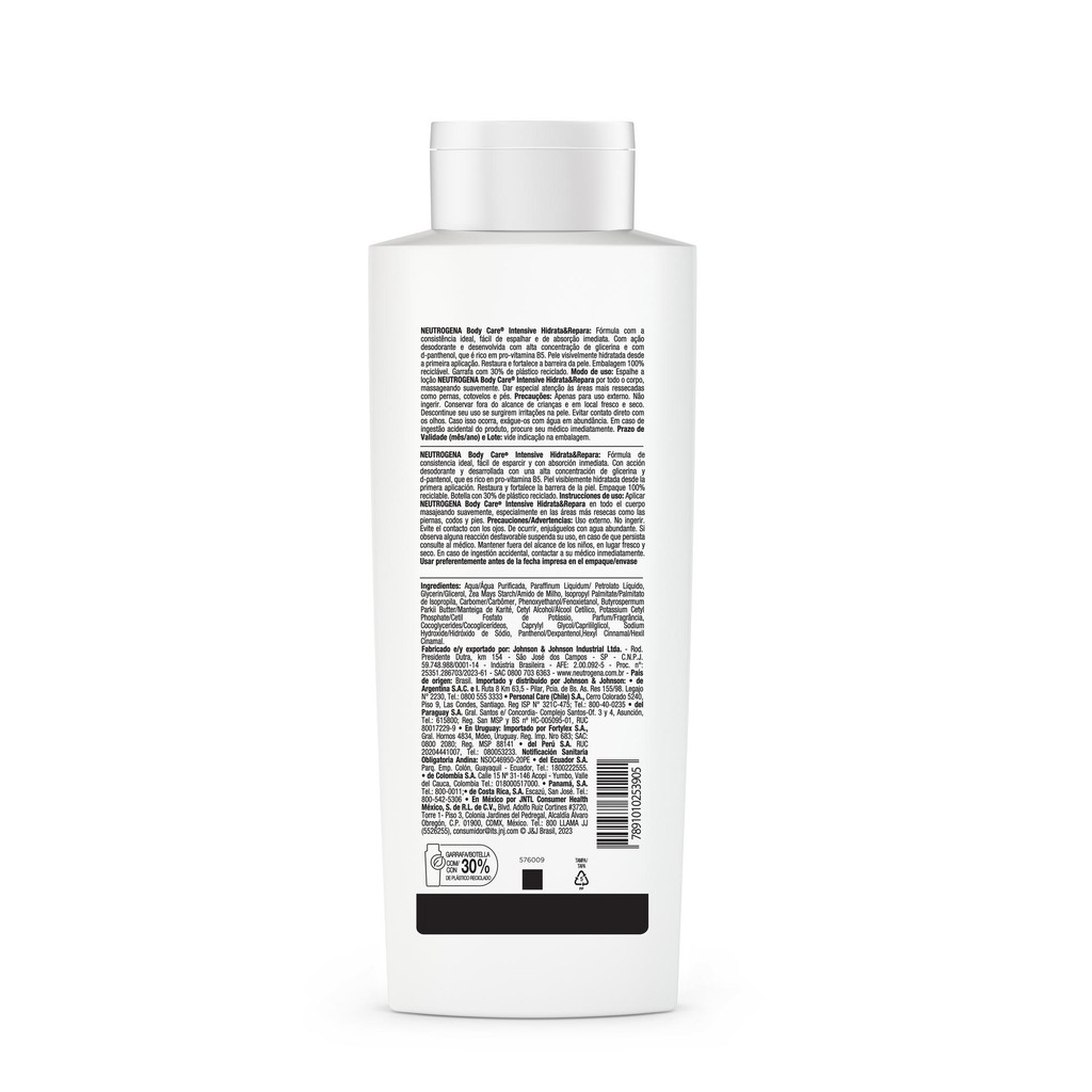 O que é e para que serve? Um hidratante corporal com alta concentração de D-Pantenol, ativo rico em Vitamina B5, que restaura a barreira protetora da pele desde a primeira aplicação. Com tecnologia catiônica, oferece hidratação intensa de alta fixação adequada até para as peles mais delicadas. Benefícios e diferenciais -Restaura a barreira protetora da pele desde a primeira aplicação -Hidratação de alta fixação por 48 horas -Textura ultraleve de absorção imediata -Ideal para pele seca e extrasseca Como usar Aplique o produto sobre toda a pele do corpo massageando suavemente até a absorção completa. Dê especial atenção às áreas mais ressecadas como pernas, cotovelos e pés. Composição Lista completa de ingredientes: Aqua, Glycerin, Distearyldimonium Chloride, Paraffinum Liquidum, Cetyl Alcohol, Isopropyl Palmitate, Paraffin, Benzyl Alcohol, Dimethicone, Parfum, Titanium Dioxide, Panthenol, Sodium Chloride, Tocopheryl Acetate. Precauções Apenas para uso externo. Não ingerir. Conservar fora do alcance de crianças e em local fresco e seco. Descontinue seu uso se surgirem irritações na pele. Evitar contato direto com os olhos. Caso isso ocorra, enxágue-os com água em abundância. Em caso de ingestão acidental do produto, procure seu médico imediatamente.