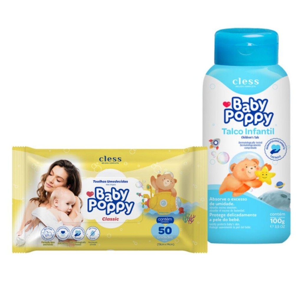 Toalhas Umedecidas Baby Poppy Basic 50 unidades: Sem traços de leite, sem álcool e tem aloe vera na formula que tem ação cicatrizante e hidratante. Talco Infantil Baby Poppy 100g: O talco infantil Baby Poppy possui ingredientes puros e protege contra o atrito e umidade da pele. Proporciona sensação de frescor com uma fragrância suave e agradável.