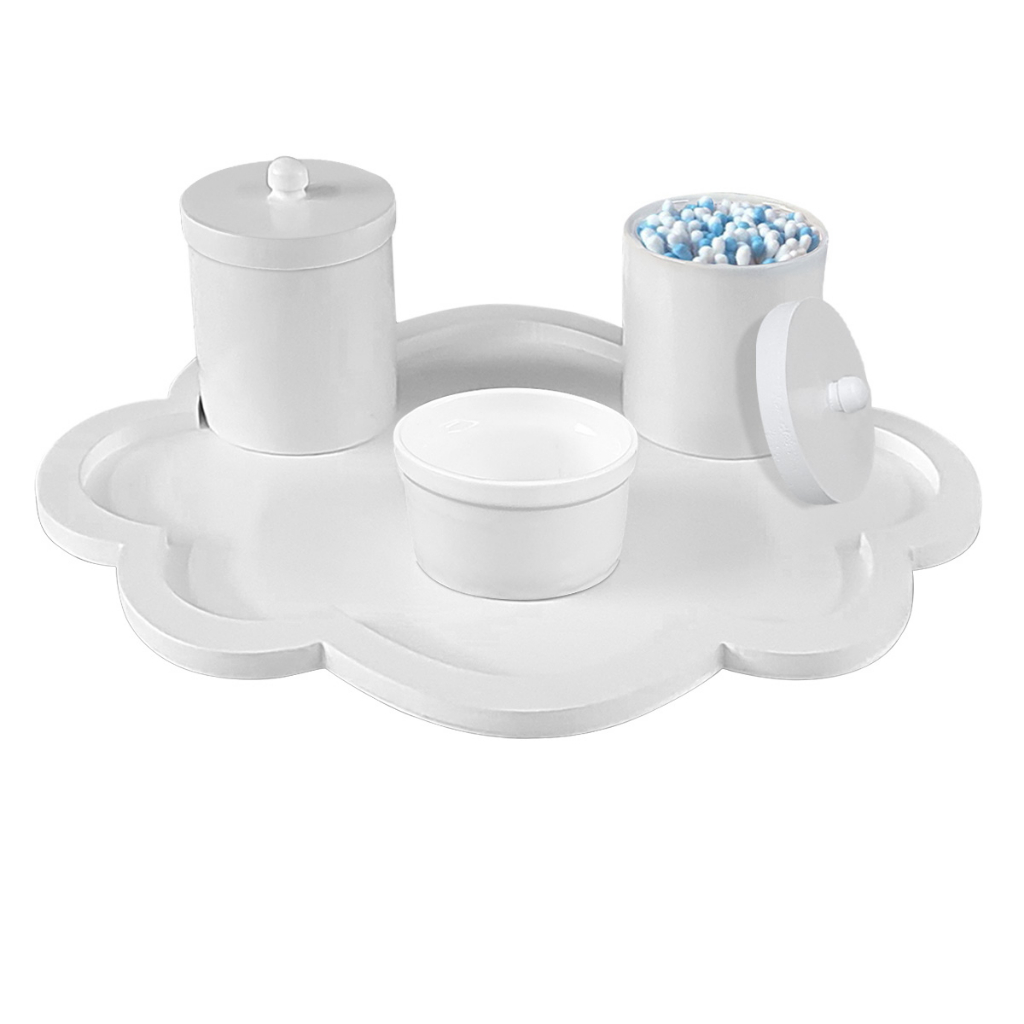 Kit Higiene Bandeja Nuvem cor Branca com Potes Porcelana tampa de Madeira
