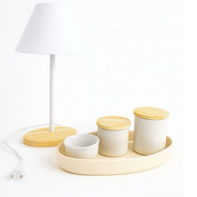 Transforme o cantinho do bebê com este Kit Higiene 5 peças, perfeito para manter tudo organizado, prático e com um toque moderno. Ideal para o quarto do bebê, berçário ou área de troca. ✨ O que acompanha: 1 Abajur com base em madeira pinus e cúpula (design clean e moderno) 1 Bandeja grande em Gesso Cerâmica 1 Pote G em porcelana com tampa de madeira pinus 1 Pote M em porcelana e tampa de madeira pinus 1 Molhadeira em porcelana (ideal para higiene do bebê) 🌿 Diferenciais do produto: Combinação elegante de madeira + cerâmica Estilo minimalista que combina com qualquer decoração Itens funcionais e fáceis de limpar Acabamento delicado e charmoso Abajur pronto para uso (acompanha fio e plug)