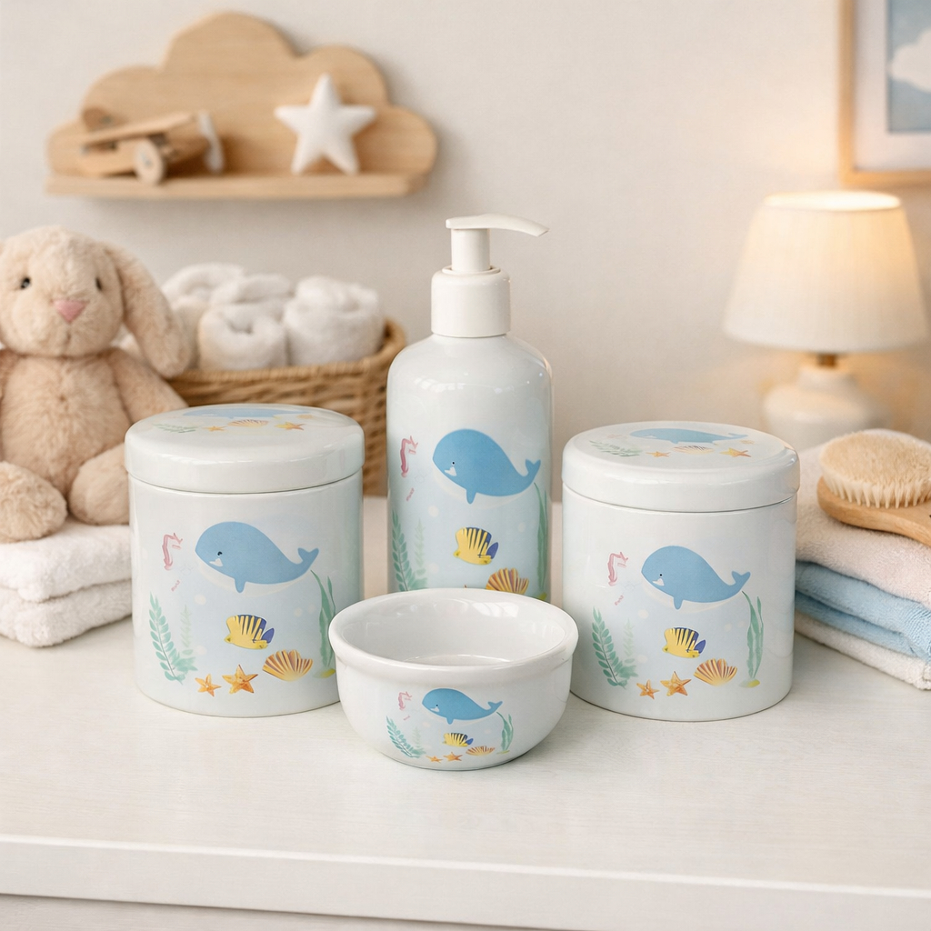 Kit Higiene Bebe Fundo Do Mar Baleia Azul Porcelana