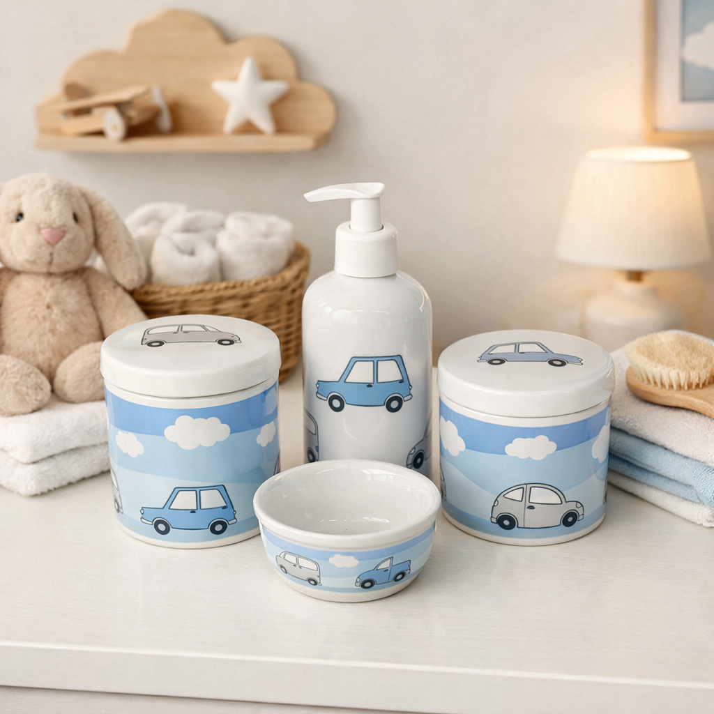 Kit Higiene Bebe Porcelana Decoracao Carrinho Azul Conjunto Potes Algodao Organizador