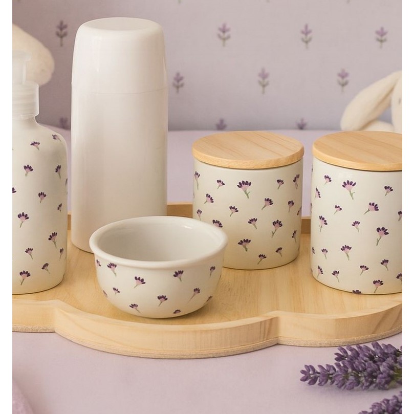 Kit Higiene Bebe Porcelana Lilas Flor Lavanda Tampas e Bandeja Pinus + Garraf 06 Pçs
