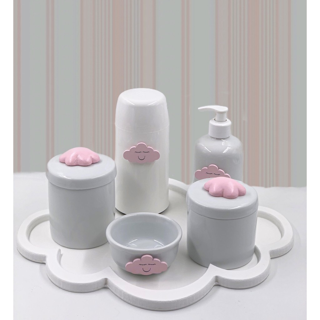 Kit Higiene Bebê Porcelana Nuvem Azul Rosa Prata Marinho Garrafa 250ml 6 Peças