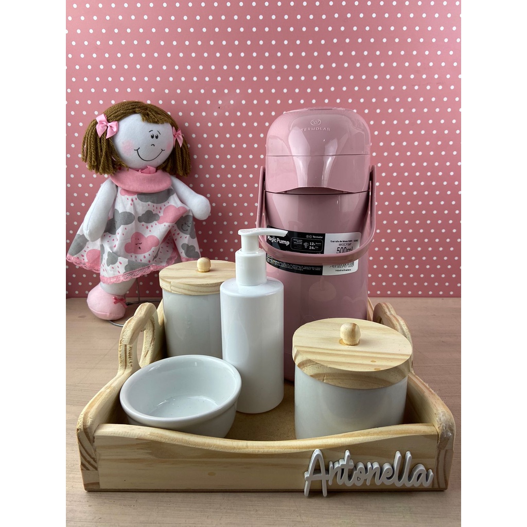 APÓS A COMPRA, ENVIAR O NOME IMEDIATAMENTE NO CAMPO MENSAGEM PARA O COMPRADOR QUE FICA NA FINALIZAÇÃO DA COMPRA. NÃO É POSSÍVEL TROCAR O NOME APÓS A CONFIRMAÇÃO. CASO NÃO SEJA INFORMADO IMEDIATAMENTE SERÁ ENVIADO SEM O NOME. O NOME É ENVIADO DESCOLADO. RECOMENDAMOS USAR COLA TIPO SUPER BONDER. O kit contém: 1 bandeja de Pinus coração com nome personalizado- 25X25cm 1 pote G de porcelana branca com tampa pinus com puxador - Altura 10 cm - Diâmetro 9x9 cm 1 pote M de porcelana branca com tampa pinus com puxador - Altura 8 cm - Diâmetro 8x8 cm 1 molhadeira de porcelana branca - Altura 6 cm - Diâmetro 9x9 cm 1 porta gel/ sabonete líquido de plástico duro branca - Altura 16 cm 1 garrafa térmica 500 ml ROSA ou 1L Branca (Escolher variação) Envio em 24 horas úteis !