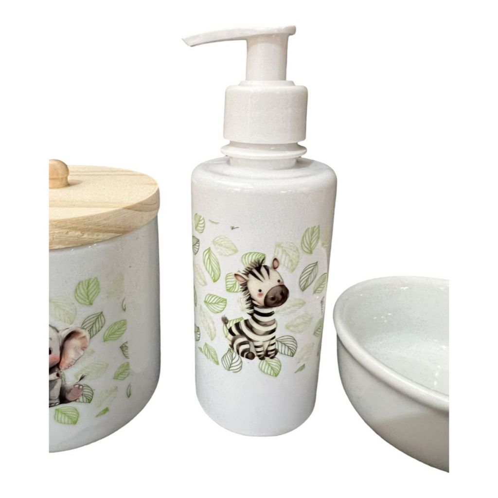 Kit Higiene Bebê Porcelana Safari Bandeja Pinus Adesivo Dtf Uv Com Nome Personalizado Garrafa Pump Bandeja Verde