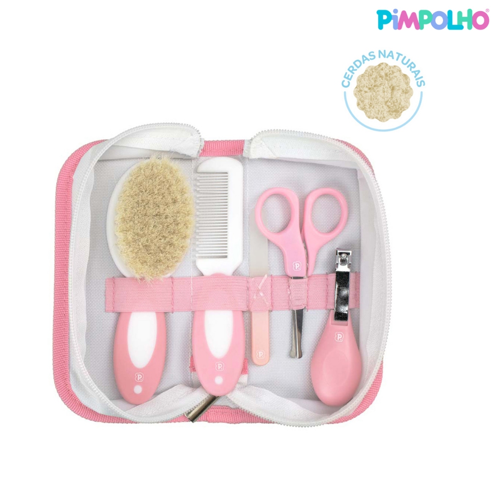 Kit Higiene Com Cerdas Naturais C/5 Peças E Necessaire InfantilPimpolho Características: Os kits de higiene da Pimpolho foram pensados visando, principalmente, a segurança e a praticidade. Acabamento fino e sem rebarbas, pontas arredondadas e design anatômico. Possui escova com cerdas de lã supermacias e pente com dentes abaulados, ambos com cabo emborrachado, tesoura com pontas arredondadas, cortador de unha com cabo anatômico e lixa feita em vidro, mais resistente, durável e segura que as lixas de papel e metal. Acompanha nécessaire feita em poliéster com forro interno e ótimo acabamento. Conservação: Lavagem a mão com temperatura máxima de 40ºC; Não alvejar; Não secar em tambor; Secagem em varal; Não passar; Não limpar a seco; Processo normal de limpeza a úmido profissional. Advertências: Mantenha fora do alcance das crianças. Fique atento aos movimentos do bebê para evitar acidentes. Antes e depois do uso, limpe os componentes metálicos com algodão embebido em álcool. Recomenda-se lavar a escova de cerdas naturais com água e sabão antes do primeiro uso. Modo de Uso: Com o bebê dormindo, corte as unhas de um dedo de cada vez, segurando-o com o polegar e o indicador. Faixa Etária: 0+