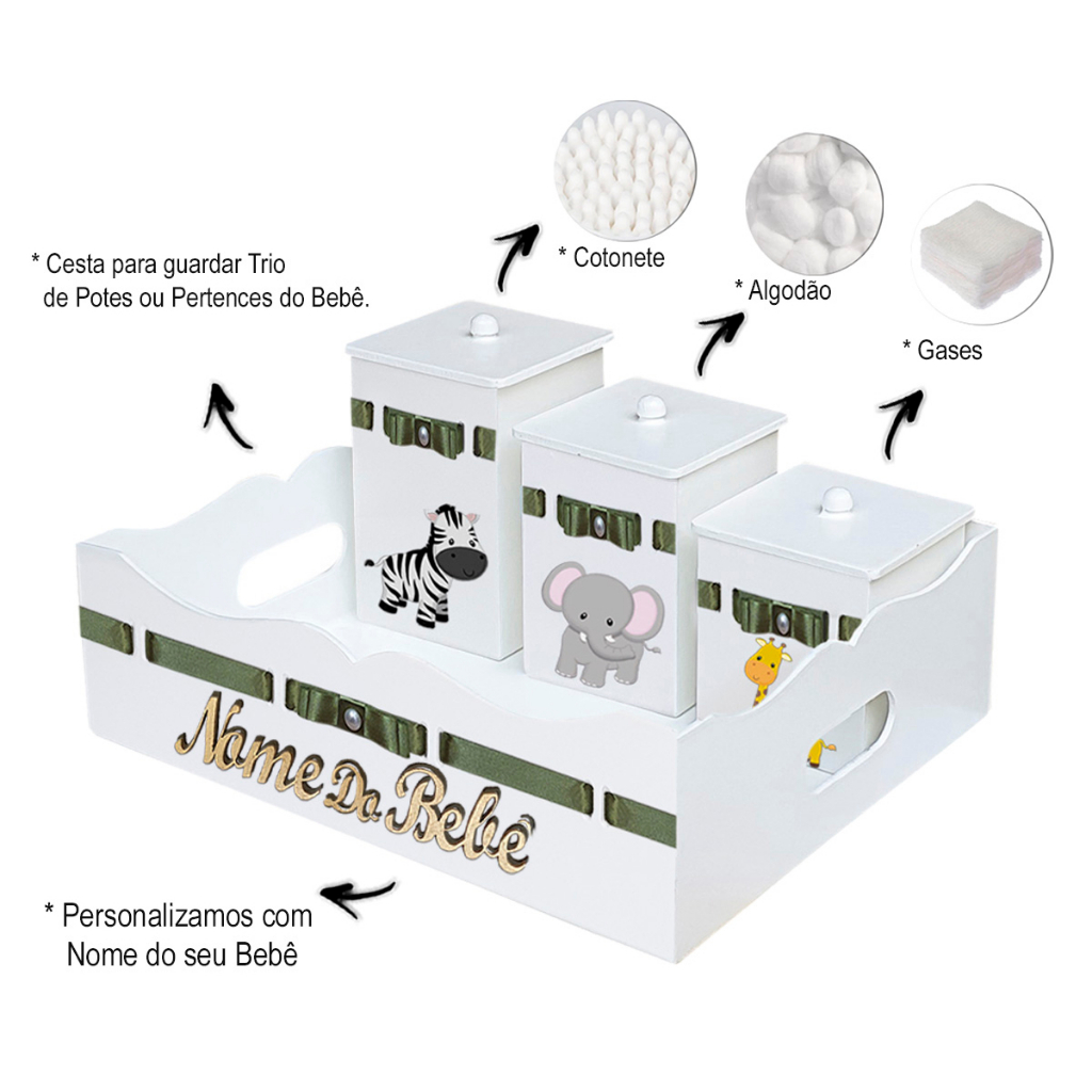 Kit Higiene Cesta com Potes e Porta Fralda em Madeira MDF Tema Safari