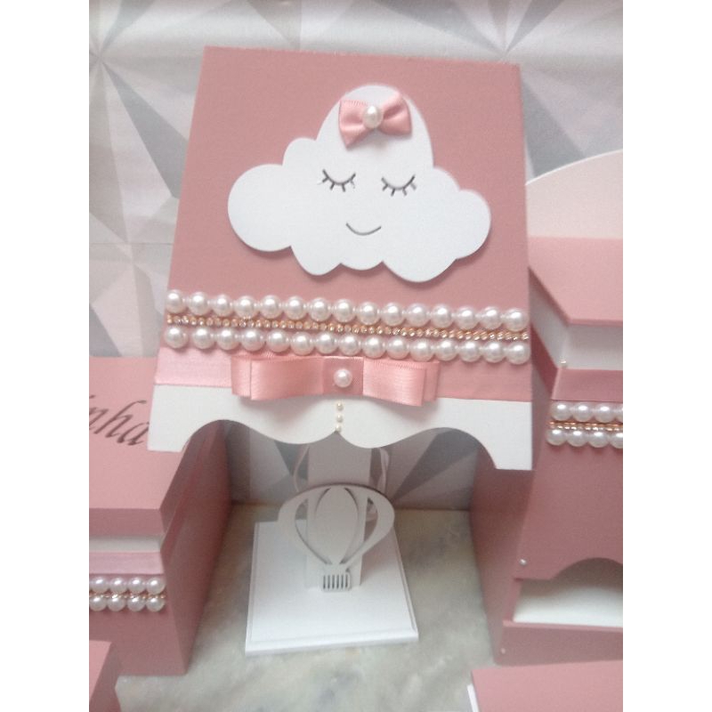 kit higiene bebê em MDF, na cor rose e branco, no tema nuvem, modelo luxo, todo trabalhado em pérolas e strass! o kit contém 8 peças sendo: 1- Abajur+ fiação bivolts 1- porta fraldas 1- farmácia 1- caixa de laços 1- bandeja+ nome da criança 3- potinhos