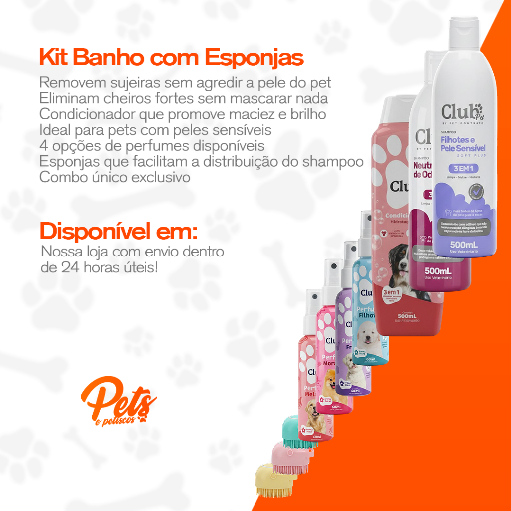 Kit Higiene Pet 3 em 1 Banho Com Escova Massageadora Dispenser Shampoos Condicionador e Perfumes Transforme o banho do seu pet em um momento mais prático, cheiroso e profissional sem sair de casa. O Kit Completo Club Pet foi pensado para oferecer limpeza profunda, hidratação e finalização perfumada em um único combo. Ideal para quem busca economia, praticidade e cuidado completo. 🧴 O que vem no kit: Shampoo Filhotes 500ml Shampoo Neutralizador de Odores 500ml Condicionador Hidratação Plus 500ml 4 Perfumes Pet 60ml (Filhotes, Frutal, Melancia e Morango) Escova Massageadora com Dispenser (cor enviada de forma aleatória) Benefícios do Kit Limpeza eficiente e suave Neutraliza odores fortes Hidrata e deixa a pelagem macia Perfume prolongado Facilita o banho com escova massageadora Ideal para uso doméstico ou pet shop 🐶 Indicado para: Filhotes Cães de todos os portes Todos os tipos de pelagem 📦 Especificações Shampoos e condicionador: 500ml cada Perfumes: 60ml cada Uso veterinário pH balanceado Garanta agora o kit completo e proporcione mais cuidado, higiene e perfume para o seu pet. Aproveite antes que acabe! 🚀