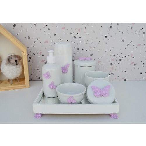 Kit Higiene Porcelana K045 Cuidados Banho Completo Borboletas Lilás Moderno Bebê Bandeja Térmica