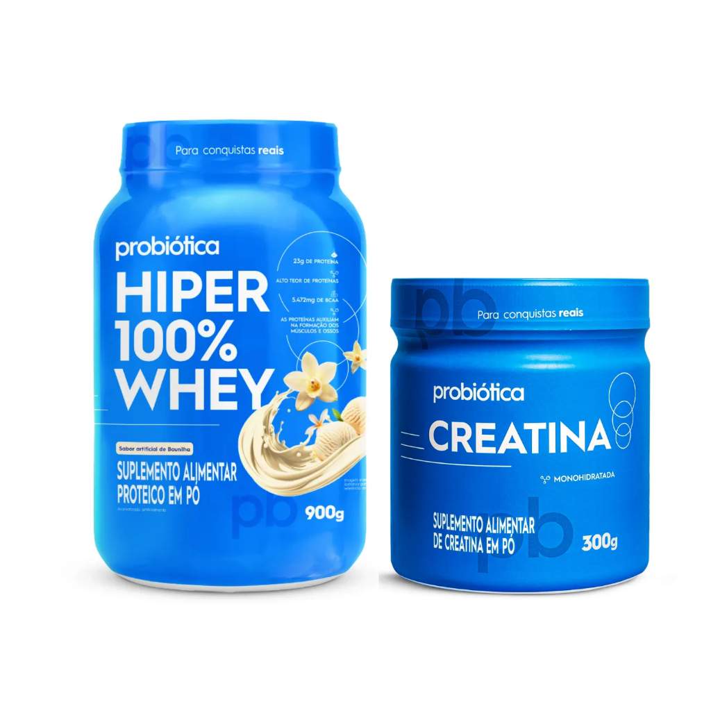 Elaborado com proteína concentrada do soro do leite (whey protein) de alta qualidade, o HIPER 100% WHEY é um suplemento a base de proteína de rápida absorção, importante no processo de síntese proteica. Ideal para consumo próximo ou após os treinos, fornece 23g de proteínas por porção, que auxiliam na formação dos músculos e ossos. Tamanho 900 g Sobre o Produto Elaborado com proteína concentrada do soro do leite (whey protein) de alta qualidade, o HIPER 100% WHEY é um suplemento a base de proteína de rápida absorção, importante no processo de síntese proteica. Ideal para consumo próximo ou após os treinos, fornece 23g de proteínas por porção, que auxiliam na formação dos músculos e ossos. Recomendação de uso Utilize de uma a duas porções ao dia, ou conforme orientação profissional. Indicado para maiores de 19 anos. Ingredientes Todos os sabores são utilizada na fabricação da proteína do soro do leite com a função de deixar o produto instantâneo (fácil diluição). E NÃO CONTÉM GLUTEN Sabor : Baunilha Proteína concentrada do soro do leite (WPC), emulsificante lecitina de soja*, aromatizante e edulcorante sucralose. Sabor : Chocolate Proteína concentrada do soro do leite (WPC), cacau alcalino em pó, aromatizantes, emulsificante lecitina de soja e edulcorante sucralose. Sabor : Cookies e Cream Proteína concentrada do soro do leite (WPC), cookies (farinha de trigo enriquecida com ferro e ácido fólico, gordura de palma, cacau em pó, fécula de mandioca, sal, polidextrose, edulcorantes sorbitol e sucralose, fermentos químicos bicarbonato de sódio e pirofosfato ácido de sódio, aromatizante e emulsificante lecitina de soja), cloreto de sódio, cacau alcalino em pó, aromatizantes, emulsificante lecitina de soja, espessante goma xantana e edulcorante sucralose. Sabor : Morango Proteína concentrada do soro do leite (WPC), aromatizantes, emulsificante lecitina de soja, espessante goma xantana, acidulante ácido cítrico, edulcorante sucralose e corantes artificias amaranto e azul brilhante FCF. Benefícios 23g de proteína por porção Até 5.472mg de BCAA por porção (quantidade de BCAA podendo variar de acordo com o sabor do produto) Alto teor de proteínas As proteínas auxiliam na formação dos músculos Aminoácidos naturalmente presentes nas proteínas do produto Modo de Preparo Para o preparo de uma porção, misture 40g (2 dosadores*) do produto em 200mL (1 copo) de sua bebida preferida (água gelada, leite desnatado, etc). A quantidade da porção no dosador pode variar em função da densidade e outras características do produto. A Creatina 300g da Probiótica é a escolha perfeita para quem busca experimentar os benefícios da creatina em um formato compacto e prático. Composta por creatina monohidratada de alta pureza, este suplemento fornece uma dose eficaz de 3.000mg por porção, ajudando a melhorar o desempenho atlético, aumentar a força muscular e acelerar a recuperação pós-treino. Seu tamanho menor é ideal para quem deseja experimentar o produto ou busca uma opção fácil de transportar e armazenar. Reconhecida como um dos suplementos mais versáteis e essenciais para atletas e praticantes de atividades físicas, a creatina potencializa a produção de ATP (adenosina trifosfato), a principal fonte de energia para exercícios de alta intensidade. Isso permite treinos mais intensos, aumentando a resistência e promovendo o ganho de força e hipertrofia de maneira eficiente. Com alta taxa de absorção e eficácia comprovada, a Creatina 300g da Probiótica é indispensável para quem deseja elevar sua performance esportiva com segurança. Escolher a Creatina 300g da Probiótica é optar por um produto de qualidade superior, desenvolvido por uma marca referência em nutrição esportiva no Brasil. Aproveite a conveniência desse formato e descubra como a creatina pode transformar sua rotina de treinos, ajudando a alcançar seus objetivos de saúde, força e condicionamento físico de forma prática e eficaz. Tamanho 300 g Sobre o Produto A CREATINA auxilia no aumento do desempenho físico durante exercícios repetidos de curta duração e alta intensidade. Trata-se de um produto destinado a complementar os estoques endógenos de creatina. Uma porção de 3g do produto (1 dosador) contém 3g de creatina. Destaques do Produto • 3.000mg de creatina monohidratada por porção • Aumento de força e desempenho • Recuperação muscular acelerada • Ganho de massa muscular magra • Suplemento seguro e eficaz Recomendação de uso Consumir uma porção ao dia. Ingredientes Creatina monohidratada e antiumectante dióxido de silício. NÃO CONTÉM GLÚTEN. Destaques HIPER WHEY: Contém Lactose CREATINA: Não contém. Modo de Preparo Adicione o pó até a marcação 3g no dosador e diluir em água ou sua bebida preferida. A quantidade da porção no dosador pode variar Advertências “ESTE PRODUTO NÃO É UM MEDICAMENTO” “NÃO EXCEDER A RECOMENDAÇÃO DIÁRIA DE CONSUMO INDICADA NA EMBALAGEM” “MANTENHA FORA DO ALCANCE DE CRIANÇAS” Alergênicos CONTÉM DERIVADOS DE LEITE E SOJA. PODE CONTER OVO.