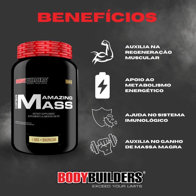 💪💥 Conquiste seu corpo dos sonhos com nosso Hiper Amazing Mass, o segredo para ganhar massa de forma eficiente e saudável! 💪💥 🌟 O Hiper Amazing Mass é mais do que um simples hipercalórico - é a fórmula perfeita para alimentar seus músculos com carboidratos complexos e proteínas de alta qualidade. Com 80% de carboidratos de rápida digestão e um mix poderoso de proteínas, vitaminas e minerais, ele é o aliado que você precisa para alcançar seus objetivos! 💪💥 🌟 E não para por aí! Com o Whey Protein 500g Refil, você potencializa seus resultados, desenvolvendo massa magra e aumentando sua força muscular. Além disso, ele ajuda na recuperação dos músculos após o treino, preparando você para o próximo desafio! 💪🌟 E para facilitar sua rotina de suplementação, a coqueteleira 600ml, para que você possa preparar suas doses de forma prática e rápida. 🥤✨ Com produtos diretamente da fábrica, garantimos qualidade premium a um custo acessível, oferecendo a você o melhor custo x benefício do mercado! 💰 💪 Não perca mais tempo e comece a transformar seu corpo hoje mesmo! 💥🚀