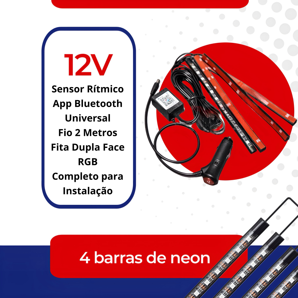 ATENÇÃO: Baixe o aplicativo para alterar as cores pelo celular. O controle funciona corretamente somente quando direcionado ao receptor (infravermelho). Se o receptor estiver muito escondido no carro, o controle não irá funcionar de maneira adequada. *POSSUI SENSOR RITMICO (Pisca conforme as batidas da música)*. Imperdível para os amantes do tuning automotivo! Este kit proporcionará uma ótima experiência para você e quem mais estiver a bordo. Podendo ser controlado com varias cores diferentes, efeitos e intensidade da iluminação, tudo através de um controle remoto. Kit composto por: - 4 barras Neon Leds; - Conector para uso no acendedor; - Controle remoto para configuração de cores, intensidade de luz e efeitos; - Toda fiação necessária para instalação; Especificação: - Material: plástico, ABS - Tipo de led: 12SMD - Tensão: DC 12 V - Funções do controle: Controle de brilho, ON/OFF, mudar a cor, e mudar os efeitos. IITENS INCLUSO: * 4 Tiras de luzes led neon RGB * 1 Carregador de Carro 12v * 1 Controle Remoto Garantia do vendedor: 90 dias