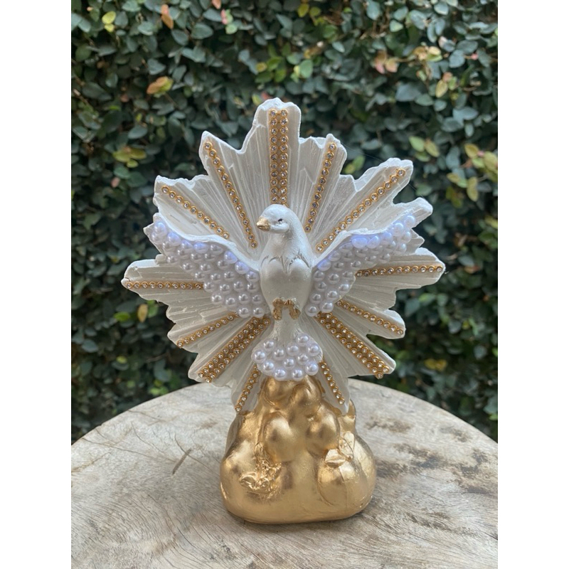 Esse lindo kit acompanha 1 imagem de Nossa Senhora Aparecida e 1 Divino espirito Santo de mesa! As imagens são toda trabalhada em pérolas feito à mão, com pintura a base de resina, dando uma resistência maior na pintura e duradoura, lindos detalhes em strass que chamam a atenção e da um toque de perfeição! Especificação: Tamanho Nossa senhora Aparecida: 15cm Tamanho do Divino: 18cm Material: Gesso Pintura: a base de Resina Sobre nossa entrega: Enviamos seu pedido super rápido, após a confirmação do pedido, embalamos com muito cuidado e carinho e enviamos ao correio em até 24 horas!
