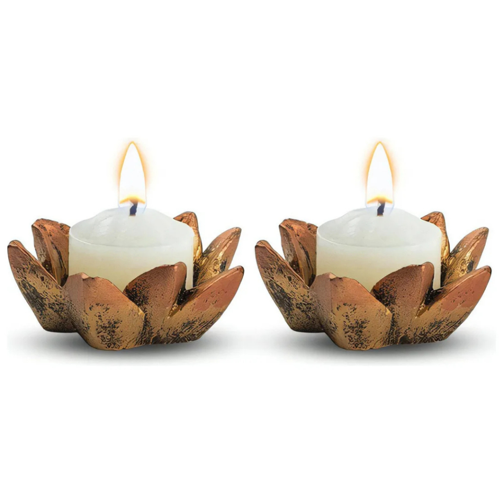 Kit Incensário Castiçal Flor de Lótus – Ouro Velho (2 Peças)