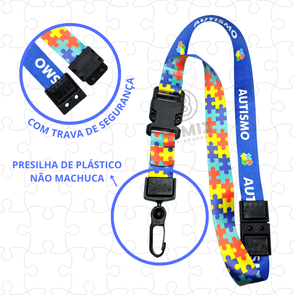 Cordão de Identificação Dupla Face Azul Rosa Infantil Autista com Trava de Segurança Anti Sufocamento Autismo. O cordão do Autismo é uma maneira simples de identificar o seu filho. Como o símbolo do autismo é reconhecido mundialmente, as pessoas saberão que seu filho precisa de uma atenção diferenciada. Possui trava de segurança que se rompe sob pressão, evitando dessa forma um acidente por sufocamento. Pode ser utilizado para levar crachá de identificação em passeios ou apenas como adorno. Também pode ser utilizado como chaveiro! Especificações: O cordão tem acabamento com materiais de plástico, para que a criança ou adulto com Autismo não se machuque, e também conta com a trava de segurança Anti Sufocamento, evitando asfixia. Dados técnicos: -Medida: 38 X 2 CM (Comprimento X Largura - Aberto) -Acabamento: Mosquete de Plástico Preto, Trava de Segurança Preto - Material: 100% Poliéster de alta qualidade (Não descasca) Impressão com Cores vivas O KIT É COMPOSTO POR: - 01 CORDÃO COM TRAVA DE SEGURANÇA - 01 PULSEIRA AZUL AUTISMO - 01 PORTA CRACHÁ AZUL