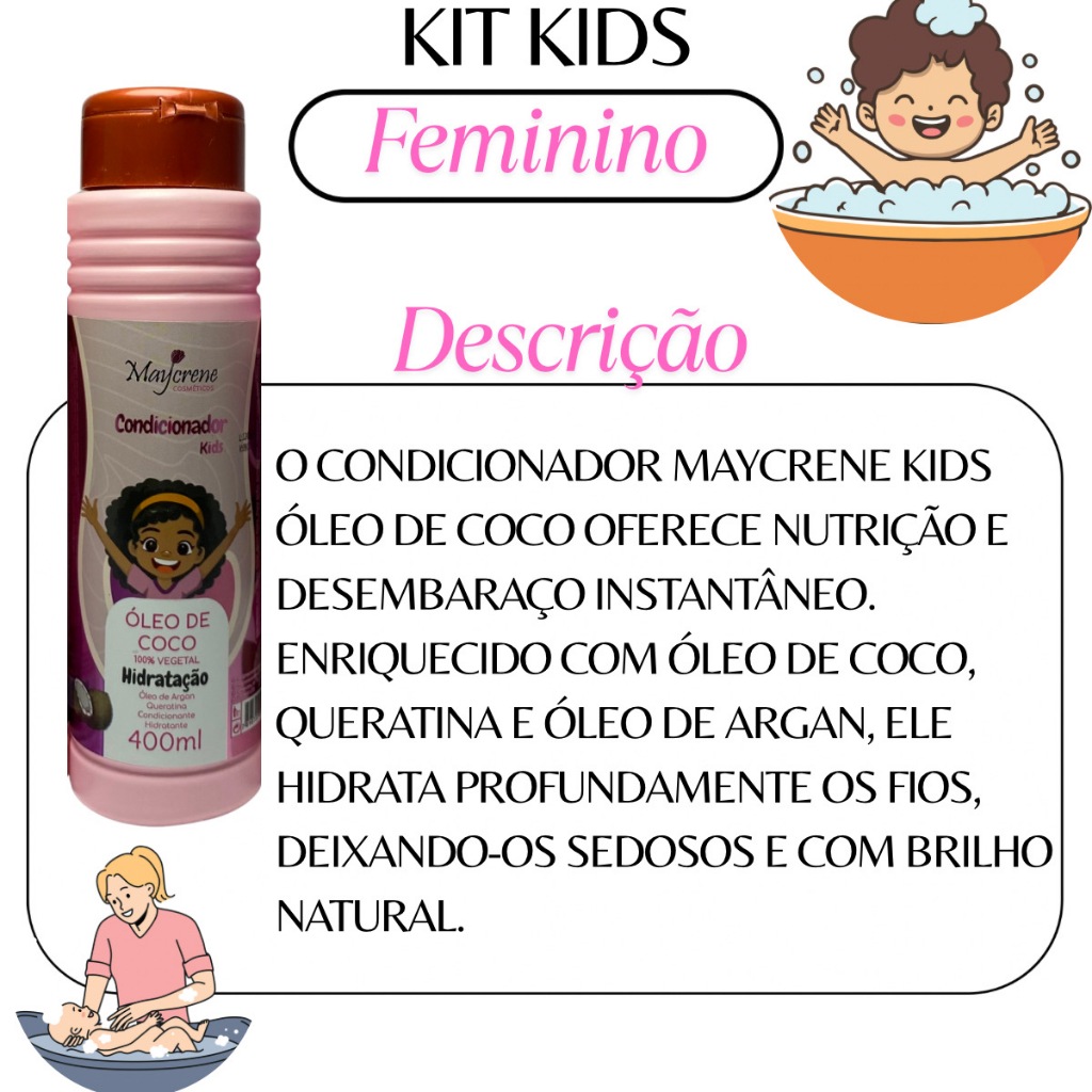 O Kit Maycrene Kids Óleo de Coco foi desenvolvido especialmente para cuidar dos cabelos das crianças com delicadeza, proporcionando hidratação, brilho e maciez desde o primeiro uso. Com fórmula suave e ingredientes 100% vegetais, é ideal para todos os tipos de cabelo infantil. Contém: Shampoo Kids Óleo de Coco 400ml Condicionador Kids Óleo de Coco 400ml Creme para Pentear Kids Óleo de Coco 1kg Descrição: O Kit Óleo de Coco Kids Maycrene oferece uma rotina completa de cuidados capilares para crianças. Enriquecido com Óleo de Coco, Óleo de Argan e Queratina, ele limpa suavemente, desembaraça e hidrata profundamente os fios, deixando-os fáceis de pentear e com um brilho natural. Sua fragrância suave e fórmula sem agressivos garante conforto e segurança para o uso diário. Modo de Uso: Shampoo: Aplique nos cabelos molhados e massageie até formar espuma. Enxágue bem. Condicionador: Após lavar, aplique o condicionador nos fios úmidos, deixe agir por alguns minutos e enxágue. Creme para Pentear: Com os cabelos úmidos ou secos, aplique uma pequena quantidade do creme, distribuindo uniformemente. Não enxágue e finalize como desejar. Benefícios: Hidratação intensa e duradoura Facilita o desembaraço e reduz o frizz Fortalece os fios e previne o ressecamento Promove brilho natural e maciez Fórmula suave, ideal para uso infantil diário