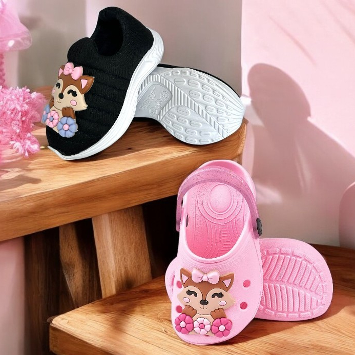 Kit Infantil Menina Tênis Calce Fácil + Babuche Emborrachado Raposa Casual Escolar Promoção