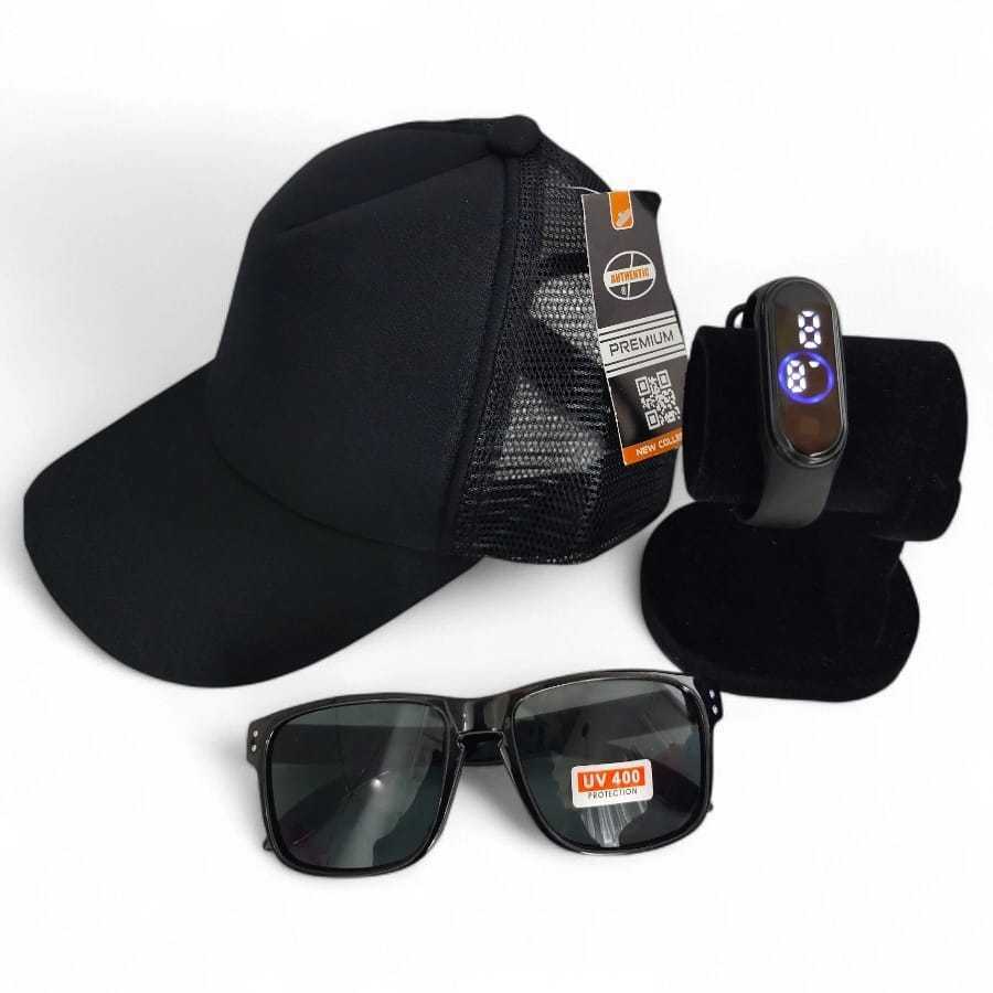 UM LINDO KIT INFANTIL ÓCULOS, BONÉ, E RELÓGIO PARA PRESENTEAR SEU FILHO, SOBRINHO OU NETINHO ELE IRÁ AMAR ESSE KIT E FICAR MUITO ESTILOSO ESSE KIT CONTÉM OS SEGUINTES ITENS : 1 BONÉ 1 RELÓGIO E 1 ÓCULOS NA COR PRETO