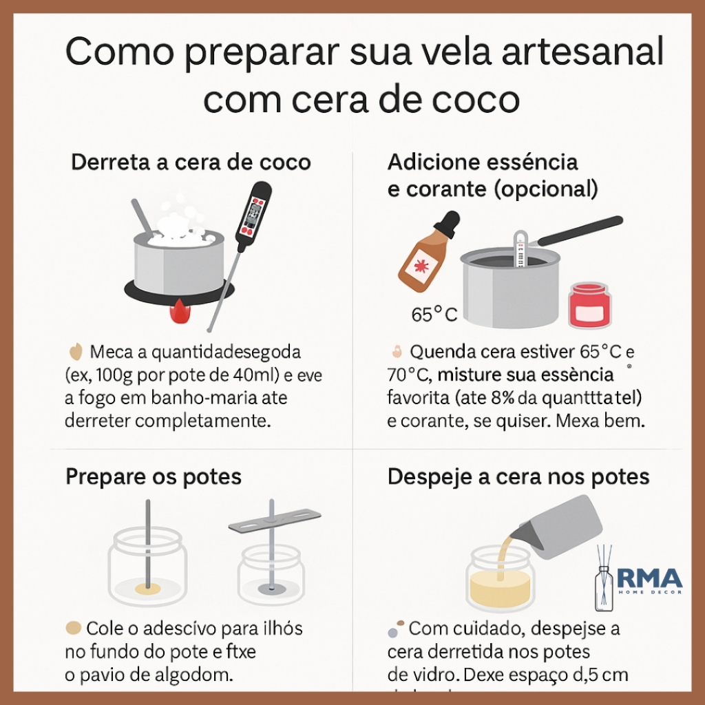 Kit Iniciante para Velas Artesanais Cera de Coco 1kg + Adesivo 10 Pavios + 10 Potes Geleinha 40ml + Termômetro + Balança