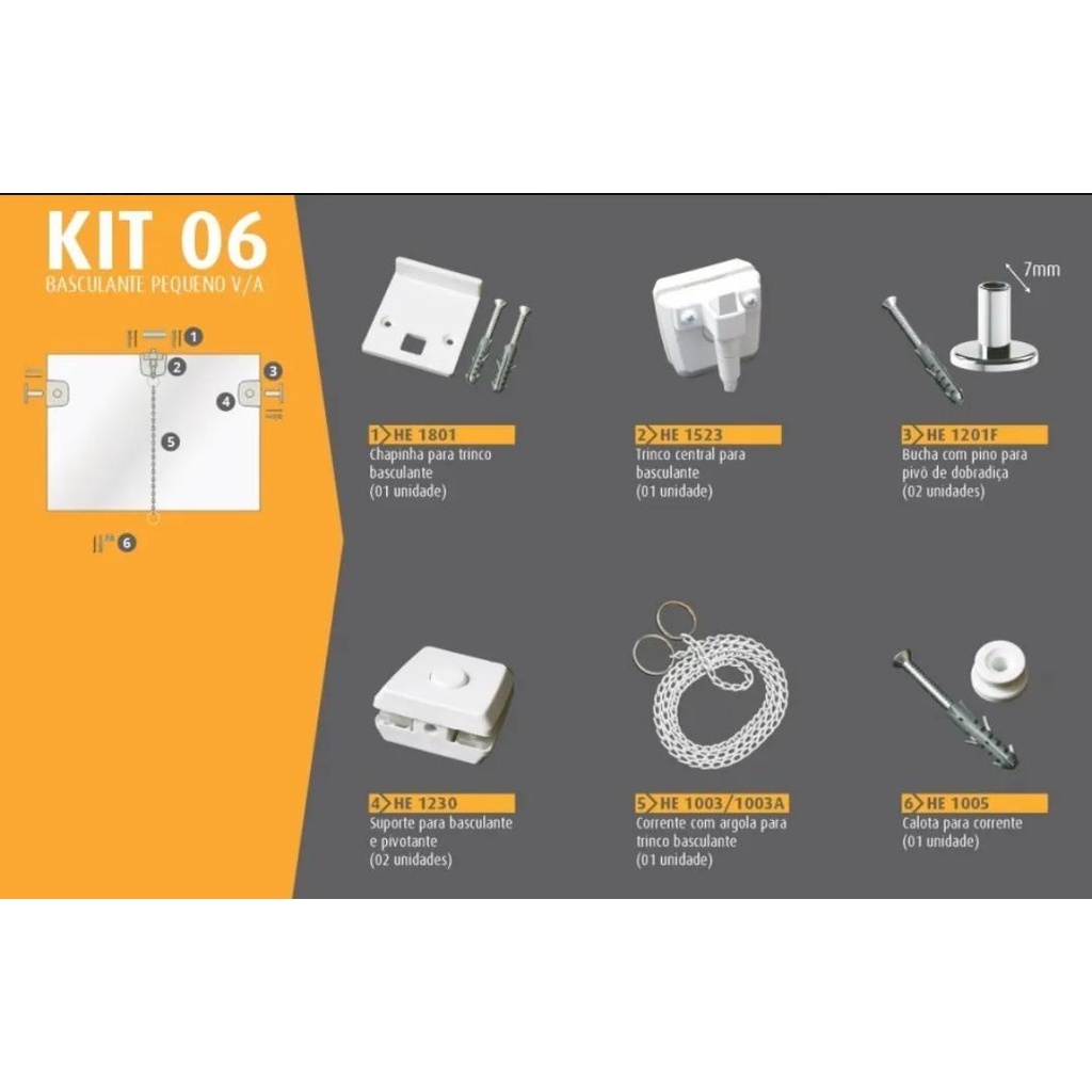 Kit 06 para Instalação de Basculante de Vidro Temperado, peças de altíssimas qualidade, prontas para o uso e com boa durabilidade. Fácil cálculo do ponto giro conforme foto acima já contendo todo o cálculo detalhado. Para Vidros de 06 a 10 mm de Espessura. Acompanha: 1 Chapinha para Trinco (1801) 1 Trinco (1523) 2 Pino para pivô de dobradiça (1201F) 2 Suporte para basculante e pivotante (1230) 1 Corrente com argola (1003/1003A) 1 Calota para corrente (1005) Material: Polímero.