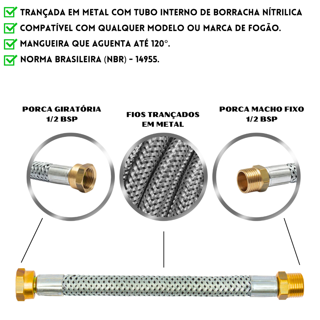Aviso ao Cliente: Por favor, confirme as medidas da mangueira e os detalhes das conexões para evitar compras equivocadas. Antes de finalizar sua compra, é crucial verificar com atenção a medida da mangueira. Certifique-se de que o comprimento de 1,20mts atende às suas necessidades específicas de instalação e espaço. A escolha do tamanho adequado é essencial para garantir uma montagem correta e segura, evitando inconvenientes futuros. Em caso de dúvidas quanto à medida ou compatibilidade com seu aparelho, não hesite em nos contactar para obter orientação especializada. A sua segurança e satisfação são nossa prioridade. - Descrição do Produto: Tipo de Produto: Flexível de Borracha para Condução de Gases GLP/GN. Conformidade Normativa: Atende às Normas NBR 13.419 e NBR 14.955. Resistência Térmica: Capacidade de suportar altas temperaturas, com aprovação e homologação por técnicos especializados e bombeiros. Compatibilidade Universal: Adequado para todas as marcas e modelos de fogões de gás domésticos, fornos a gás, fogões industriais, queimadores de gás e cooktops. Ideal também para aparelhos embutidos, como aquecedores a gás. Aplicação Versátil: Apropriado para ambientes residenciais, comerciais e industriais. Construção Reforçada: Tubo interno reforçado com trançado de fios de borracha nitrílica, proporcionando resistência mecânica e durabilidade sob condições de pressão e movimentação. Conexões: Rosca 1/2 Macho NPT x 1/2 Fêmea NPT com terminais de latão que garantem maior durabilidade e segurança. Design Inteligente: Luva sextavada no lado fêmea giratória para facilitar a instalação com o uso de contra chave, prevenindo torções no produto. - Conteúdo da Embalagem: 1 Flexível Nitrílico/Alumínio - 1,20 mts. 1 Adaptador Dako Fêmea 1/2 NPT 1 Anel de vedação. 2 Vedações para o adaptador 1 Veda rosca. - Orientações Básicas: Normas de Segurança: Verifique a conformidade das mangueiras com as normas de segurança e regulamentações locais para instalações de GN e GLP, visando uma instalação segura. Certificações: Escolha mangueiras certificadas para uso com GN e GLP, assegurando que atendam aos padrões e regulamentações aplicáveis. Conexões: Certifique-se de que as conexões estejam bem apertadas e adequadamente vedadas para evitar vazamentos, utilizando as ferramentas corretas. Inspeção Regular: Realize inspeções periódicas em busca de danos, desgastes ou corrosão, substituindo as mangueiras comprometidas para manutenção da segurança e integridade do sistema. - Aviso de Garantia e Suporte ao Cliente: Este produto acompanha uma garantia de 3 meses contra defeitos de fabricação. Estamos comprometidos em fornecer a você toda a assistência necessária, garantindo sua plena satisfação. Em caso de qualquer problema com o produto durante o período de garantia, oferecemos um suporte completo para a troca ou reembolso, conforme sua preferência. Reforçamos a importância de entrar em contato conosco imediatamente ao identificar qualquer questão, para que possamos resolver a situação de maneira rápida e eficiente. Nosso objetivo é assegurar que sua experiência com nosso produto seja a melhor possível, desde o momento da compra até o uso cotidiano.
