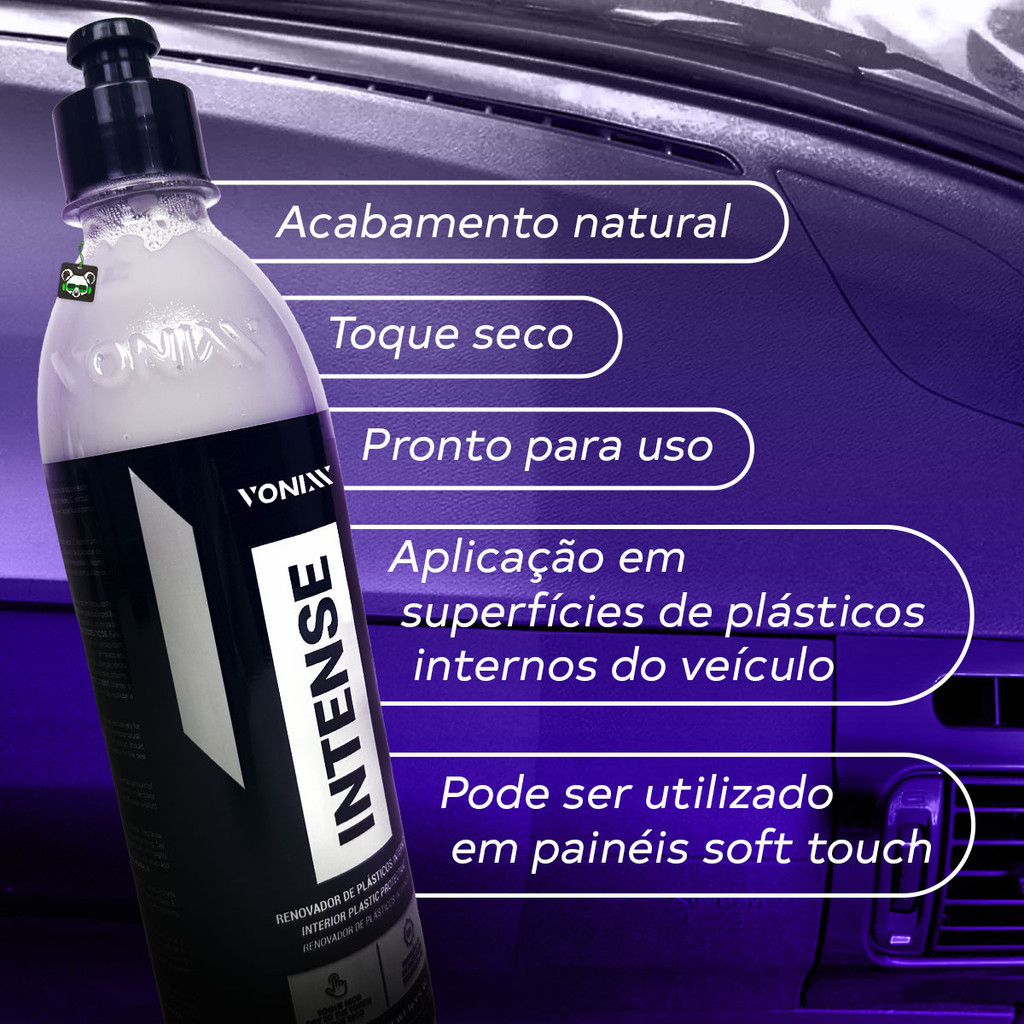 Kit Restaura e Renova Plásticos Automotivos Restaurax e Intense 500ml Vonixx KIT RESTAURADOR DE PLÁSTICOS INTENSE + RESTAURAX 500ML VONIXX Com esse Kit, você renova e protege os plásticos internos e externos do seu carro de forma rápida e fácil, deixando-os com um aspecto impecável de novo! INTENSE -> MANTENHA O INTERIOR DO SEU VEÍCULO IMPECÁVEL Intense é a escolha ideal para quem busca qualidade e durabilidade na manutenção dos plásticos internos do carro. - Proteção UV; - Toque Seco; - Acabamento Natural; - Fácil Aplicação; - Durabilidade de 6 meses; - Produto pronto para uso; - Pode ser utilizado em painéis soft touch. PROTEÇÃO UV Oferece proteção contra os danos causados pelos raios solares, mantendo os plásticos com aparência renovada por até 6 meses. ACABAMENTO NATURAL E TOQUE SECO Proporciona um acabamento suave e natural, sem deixar resíduos pegajosos. Seu toque seco é perfeito para superfícies como vinil e plásticos em geral. FÁCIL APLICAÇÃO Basta aplicar uma pequena quantidade uniformemente na superfície limpa e seca. Qualquer excesso pode ser removido com uma toalha de microfibra. *O produto deve ser utilizado especificamente na parte interna do automóvel, em superfícies como vinil e plásticos em geral. Não é recomendado o uso em plásticos externos e em couro. RESTAURAX -> A SOLUÇÃO PERFEITA PARA PLÁSTICOS ESBRANQUIÇADOS! Remove sujeiras, manchas e resíduos, deixando as superfícies plásticas com aspecto de novo. CONTÉM POLÍMEROS ESPECIAIS Ação especial garantindo proteção contra as ações do tempo, evitando a degradação precoce do material. FÁCIL APLICAÇÃO Basta limpar bem a superfície e aplicar o produto com um aplicador de espuma até a completa restauração. DICA DE MANUTENÇÃO Para manter o plástico sempre novo, repita a aplicação a cada 60 dias na parte externa e a cada 6 meses na parte interna. APLICAÇÃO Para-choque Painéis Laterais de portas Capota marítima ** Não recomendamos o uso do produto em couro. ESPECIFICAÇÕES TÉCNICAS: RESTAURAX - Disponível em: 500ml - Diluição: Pronto uso - Estado Físico: Líquido - Cor: Roxo INTENSE - Disponível em: 500ml - Diluição: Pronto uso - Estado Físico: Líquido Viscoso - Cor: Cinza CONTEÚDO DA EMBALAGEM: - 01 Restauraxx 500ml Vonixx - 01 Intense 500ml Vonixx
