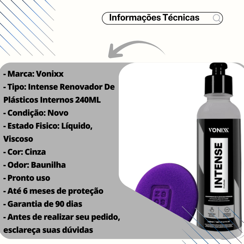 | Kit Intense Vonixx 240ml Revitaliza Painel e Plásticos Internos + A... este produto | R$ 36,72 | 20% | 5.0/5 | — |