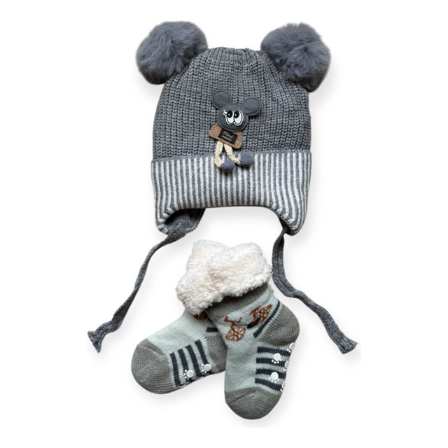 Kit Inverno Bebê Menino Touca Forrada Pompom E Meia Térmica