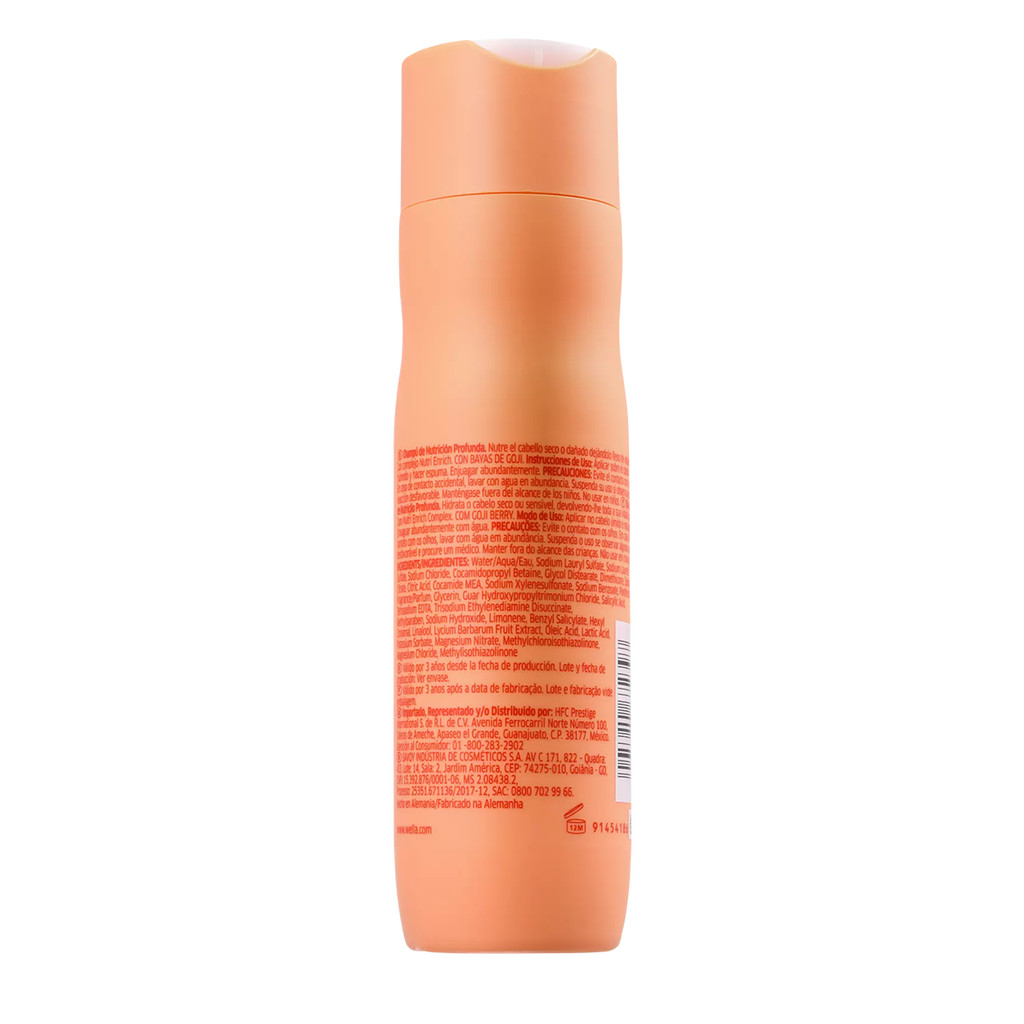 Kit Nutri Invigo Enrich Shampoo 250ml e Mascara 150ml O kit contém 01- Shampoo Wella Professionals Invigo Nutri-Enrich - 250ml 01- Máscara de Nutrição Wella Professionals Invigo Nutri-Enrich - 150ml Sobre o produto Kit Wella Professionals Invigo Nutri-Enrich é uma tratamento para cabelos secos, ressecados ou com química. Atua na melhora a qualidade do fio com nutrição e hidratação de forma rápida e eficaz. Suas fórmulas suavizam o cabelo para proporcionar brilho e maciez. Shampoo Invigo Nutri-Enrich tem o poder de hidratar e nutrir os fios desde o momento da lavagem. Máscara Invigo Nutri-Enrich hidrata e nutre profundamente para restaurar a saúde dos fios e ainda garantir um toque sedoso e muito brilho. Ação GOJI BERRY: uma fruta com alta concentração de vitaminas antioxidantes, minerais e peptídeos que melhoram a saúde do cabelo; ÁCIDO OLEICO E PANTENOL: proporcionam hidratação e nutrição de alta performance; VITAMINA E: protege o cabelo de danos futuros. Modo de usar: Com o cabelo úmido aplique o shampoo. Massageie suavemente e enxágue. Repita o procedimento, se achar necessário. Com o cabelo limpo e úmido aplique a máscara. Distribua pelo comprimento e pontas dos fios e deixe agir por 5 minutos. Enxague em seguida. Resultado Cabelo fica limpo, nutrido e hidratado, com toque macio e muito brilho em apenas 30 segundos. Cuidados/Restrições Evite o contato com os olhos. Caso isso aconteça, enxágue com água em abundância. Havendo irritação, suspender o uso e procurar orientação médica. Não ingerir. Manter fora do alcance de crianças. Uso externo.