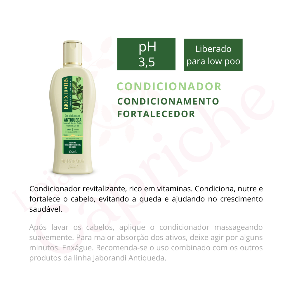 Kit Jaborandi Shampoo, Condicionador, Banho de Creme 250mL e Finalizador 150g Bio Extratus Combinação exclusiva de extratos vegetais, enriquecida com vitaminas que revitalizam, fortalecem e restauram cabelos com queda e pouco crescimento. SHAMPOO 250mL LIMPEZA REVITALIZANTE Limpa e revitaliza o cabelo. A associação balanceada dos extratos e vitaminas nutre o bulbo capilar e tonifica o couro cabeludo, proporcionando força e saúde ao cabelo. Distribua uniformemente sobre o cabelo molhado, massageando suavemente sem esfregar os fios. Enxágue bem e, se necessário, repita a aplicação. CONDICIONADOR 250mL CONDICIONAMENTO FORTALECEDOR Condiciona e revitaliza o cabelo, fortalecendo os fios. Para uso diário, deve ser usado após o shampoo. Na hidratação semanal, aplique após o banho de creme, massageando suavemente. Para maior absorção dos ativos, deixe agir por alguns minutos. Enxágue. BANHO DE CREME 250g HIDRATAÇÃO ANTIQUEDA Tratamento revitalizante, rico em vitaminas, ideal para hidratar e fortalecer os fios. Confere brilho e maciez ao cabelo. Aplique massageando mecha a mecha. Deixe agir de 10 a 15 minutos. Para intensificar o tratamento, use touca de hidratação. Enxágue. FINALIZADOR 150g TRATAMENTO REVITALIZANTE Rico em vitaminas e extratos naturais que nutrem os fios, deixando o cabelo forte e saudável. Aplique no cabelo úmido e distribua ao longo dos fios, principalmente nas pontas e regiões mais danificadas. Não enxágue. Penteie normalmente. Use também os outros produtos da Linha Antiqueda Jaborandi, Alecrim e Quilaia, Vitaminas A, B e E. INDICAÇÃO Cabelo com queda e pouco crescimento. FUNÇÃO Atuar diretamente no bulbo capilar, estimulando o crescimento, além de auxiliar o tratamento antiqueda. RESULTADOS E BENEFÍCIOS Tonifica e nutre o bulbo capilar. Estimula o crescimento e proporciona fios fortes e saudáveis. CONTÉM: 1- Shampoo Jaborandi Bio Extratus 250mL 1- Condicionador Jaborandi Bio Extratus 250mL 1- Banho de Creme Jaborandi Bio Extratus 250g 1- Finalizador Jaborandi Bio Extratus 150g