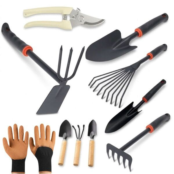 Kit Jardinagem 10 Peças Completo Com Luva, Pás, Ancinho, Tesoura de Poda, Rastelo, Enxadinha, Kit Para Vasos e Alicate