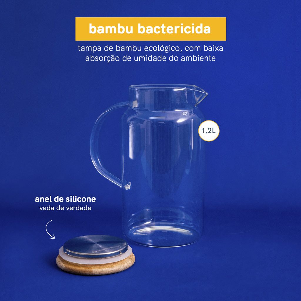 "Esse é o Kit de Jarras de Vidro com Tampa de Bambu Multiuso: pode ser usada para líquidos quentes ou frios, como águas, chás, sucos, sangrias, e o que você quiser! Versátil: da geladeira para sua mesa, no dia a dia e naquele almoço especial no final de semana De vidro: não retém gosto e cheiro, é fácil de limpar Tampa com alta aderência ao vidro: não abre ao despejar a bebida no copo Bico em v: evita respingos Conteúdo visível: transparente deixa você ver o que tem dentro Fácil de limpar: água corrente, uma esponja macia e sabão neutro Design decorativo: a tampa de bambu com silicone e inox traz um charme a mais para sua mesa Esse Kit é composto por: 1 Unidade - JARRA DE VIDRO COM TAMPA DE BAMBU 1,2L Diâmetro: 10,5cm Altura: 19,7cm 1 Unidade - JARRA DE VIDRO COM TAMPA DE BAMBU 1L Diâmetro: 8,5cm Altura: 23,8cm"