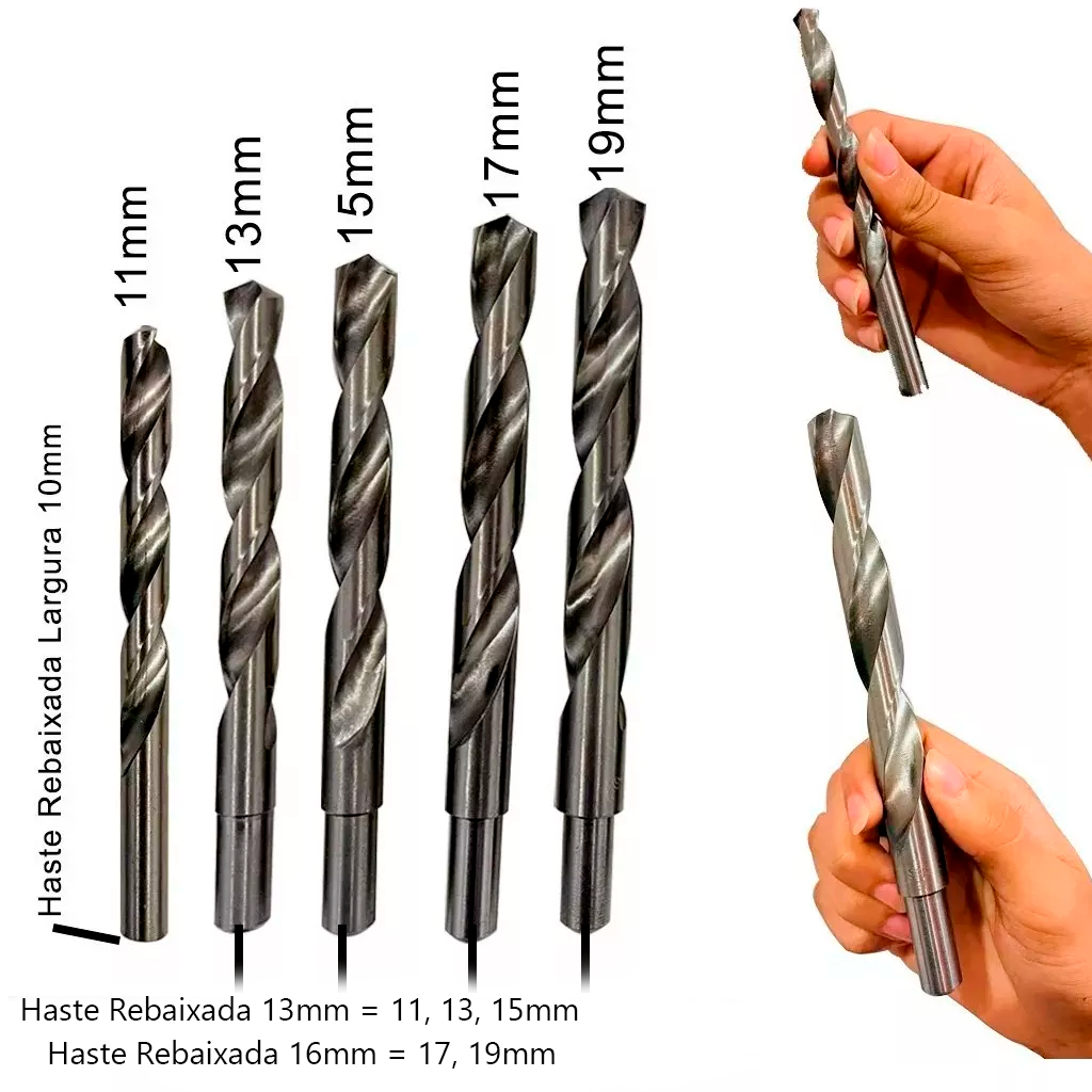 COMERCIAL VIPASA DISTRIBUIDORA. Kit Jogo 5 Brocas Aço Rápido Para Metal 11,13,15,17,19mm Haste Rebaixada Profissional Parede Furo DESCRIÇÃO: Kit com 5 brocas de aço rápido, sendo: 1 unidade 11mm Haste Rebaixada: 13mm Largura 1 unidade 13mm Haste Rebaixada: 13mm Largura 1 unidade 15mm Haste Rebaixada: 13mm Largura 1 unidade 17mm Haste Rebaixada: 16mm Largura 1 unidade 19mm Haste Rebaixada: 16mm Largura Segue as especificações do produto: . Polida. . Para metais ferrosos e não ferrosos. . Haste cilíndrica. . Ângulo de afiação de ponta de 118º. . Corpo de aço rápido (HSS). . Norma DIN 338. . Para aumento da vida útil do produto é recomendado a utilização de fluído / óleo de corte para lubrificação e resfriamento. Guia rebaixada. Também fura madeira e plástico. Aço HSS de alta velocidade . Super eficiente e resistente. O melhor custo benefício do mercado. COMERCIAL VIPASA DISTRIBUIDORA.