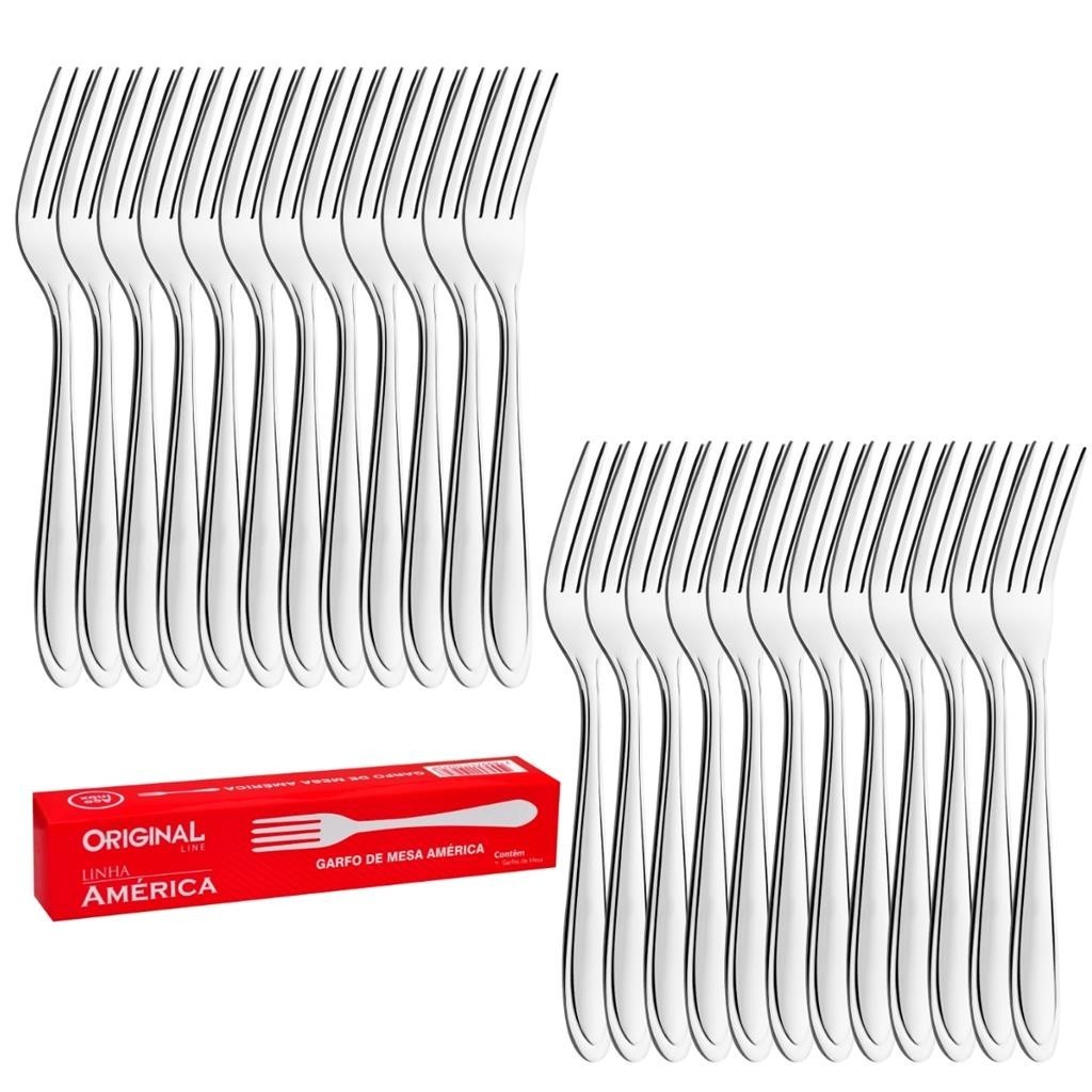 Kit Jogo Aco Inox 24 Garfos 24 Facas Pecas Mesa Churrasco Buffet Restaurante Lanchonete Hotel Refeicao Cozinha Casa America Original Line O Kit Garfo Faca de Mesa Inox Oriente com 48 pecas e perfeito para quem busca qualidade e elegancia em suas refeicoes. Feito em aco inoxidavel, tanto a lamina quanto o cabo, esse kit garfo Faca sao resistentes e duraveis, garantindo sua satisfacao por muito tempo. O Kit ele e ideal para uso em mesas de jantar, proporcionando conforto e praticidade. Adquira agora mesmo o Kit Garfo Faca de Mesa Inox America com 48 pecas e tenha uma experiencia gastronomica ainda mais especial. Medidas Garfo Mesa: . Peso: 0,34 g . Comprimento: 19,5 cm . Largura: 2,5 cm . Espessura: 1,5 mm . Material: Aco inox . Marca: Original Line Medidas Faca Mesa: . Peso: 0,34 g . Comprimento: 20.9 cm . Largura: 1,8 cm . Espessura: 2 mm . Material: Aco Inox . Marca: Original Line Conteudo Da Embalagem: . 24 Garfos Mesa . 24 Facas Mesa Cuidados: Para manter seus talheres sempre brilhando, lave com esponja macia, sabao ou detergente neutro. Produtos abrasivos como palha de aco podem riscar e prejudicar o brilho. Seque imediatamente para evitar manchas. Recomenda-se o uso de agua quente para melhorar o brilho Nao guarde em local umido, a umidade pode provocar manchas. Importante: Garantia de 3 Meses. Valor do Kit. Imagens Meramente Ilustrativas. Nao nos responsabilizamos pelo mau uso do produto.