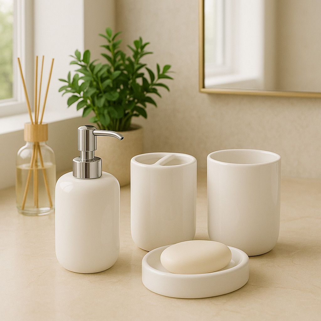 PRODUTO EM ESTOQUE, ENVIO IMEDIATO! O Kit Jogo de Banheiro Lavabo Porcelana 4 Peças é a escolha perfeita para quem deseja adicionar um toque de sofisticação e praticidade à decoração do seu lavabo ou banheiro. Com um design delicado e moderno, este conjunto oferece tudo o que você precisa para manter seu espaço organizado e estiloso. O que acompanha o kit? Dispenser para Sabonete Líquido: Facilite o dia a dia com um dispenser funcional e de fácil manuseio. Com um visual elegante, ele é ideal para manter o sabonete sempre à mão, sem perder o charme da decoração. Porta Escova de Dente: Um item essencial para quem preza pela organização e higiene. Seu design prático mantém as escovas de dente de forma segura e estilosa. Acessórios de Alta Qualidade: Feitos de porcelana resistente e de fácil limpeza, o kit é durável, garantindo que seu banheiro permaneça impecável por muito tempo. Por que escolher o nosso Kit? Design Sofisticado: Com acabamento refinado, o kit adiciona um toque de luxo e modernidade ao seu espaço, sem perder a funcionalidade. Versatilidade: Ideal para qualquer tipo de decoração, seja clássica, moderna ou contemporânea. Combinando com diversos estilos de banheiro. Praticidade no Dia a Dia: Além de organizar seu lavabo, os itens são extremamente práticos, tornando seu uso diário mais fácil e eficiente. Dimensões: *Modelo liso* dispenser sabonete líquido - 7 x 7 x 17,5cm (450ml aprox) copo organizador - 7,5 x 7,5 x 10,5cm porta escovas - 7,5 x 7,5 x 10,5cm saboneteira - 11 x 8,3 x 2,5cm *Modelo Luxo* dispenser sabonete líquido - 6,5 x 6,5 x 10,5cm (400ml aprox) copo organizador - 6,5 x 6,5 x 10,5cm porta escovas - 6,5 x 6,5 x 10,5cm saboneteira - 13 x 9,5 x 3cm