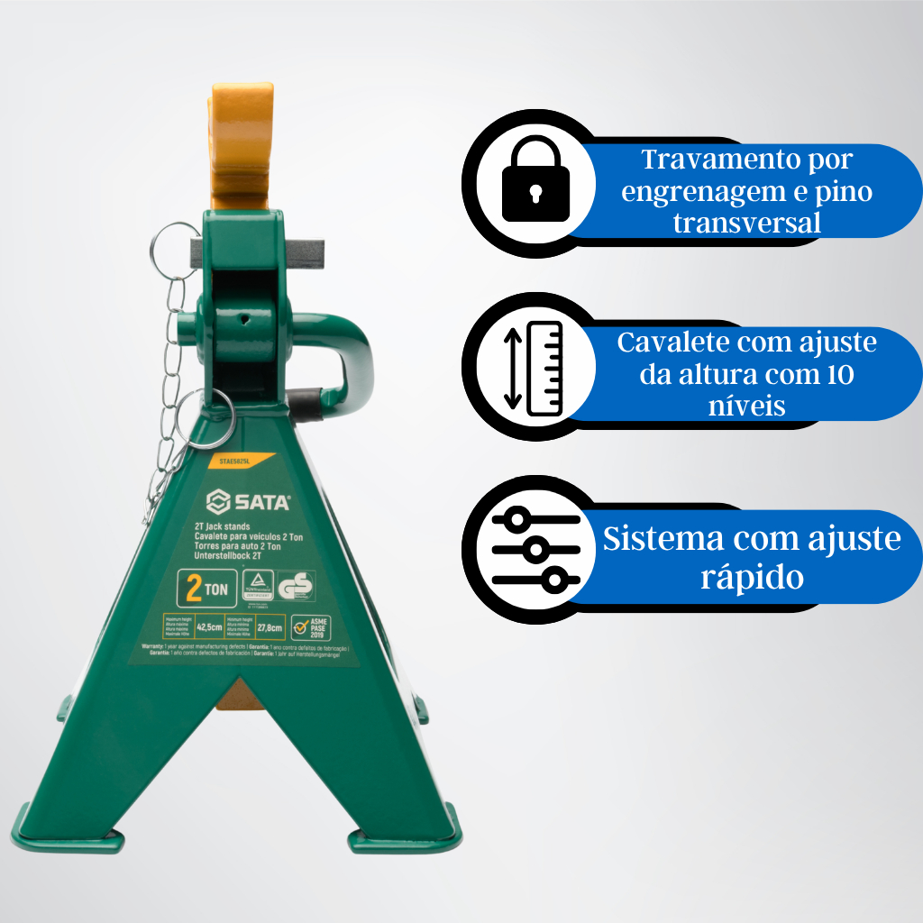 CAVALETE PARA VEICULO SATA REF STAE5825L O Cavalete para Veiculo SATA e indicado para sustentar automoveis de forma segura sendo utilizado como apoio complementar ao macaco hidraulico Conta com estrutura reforcada em aco soldado garantindo estabilidade e seguranca durante o uso Para maior confianca na operacao o cavalete possui sistema de travamento duplo e deve ser utilizado sempre em pares sobre superficies planas e rigidas CARACTERISTICAS Ajuste de altura com 10 niveis Fabricado em aco soldado por processo automatico Travamento por engrenagem e pino transversal Barra de apoio em ferro fundido com base curvada cavidade central e cavidades em degraus Base dos pes soldada oferecendo estabilidade com 4 apoios Sistema com ajuste rapido Sistema de seguranca com tripla protecao pino trava alavanca e base reforcada INFORMACOES TECNICAS Dimensoes da embalagem comprimento x largura x altura 320 x 280 x 480 mm Peso 10 kg Referencia STAE5825L Garantia 12 meses Fabricante SATA Imagens meramente ilustrativas Todas as informacoes sao de responsabilidade do fabricante ou fornecedor